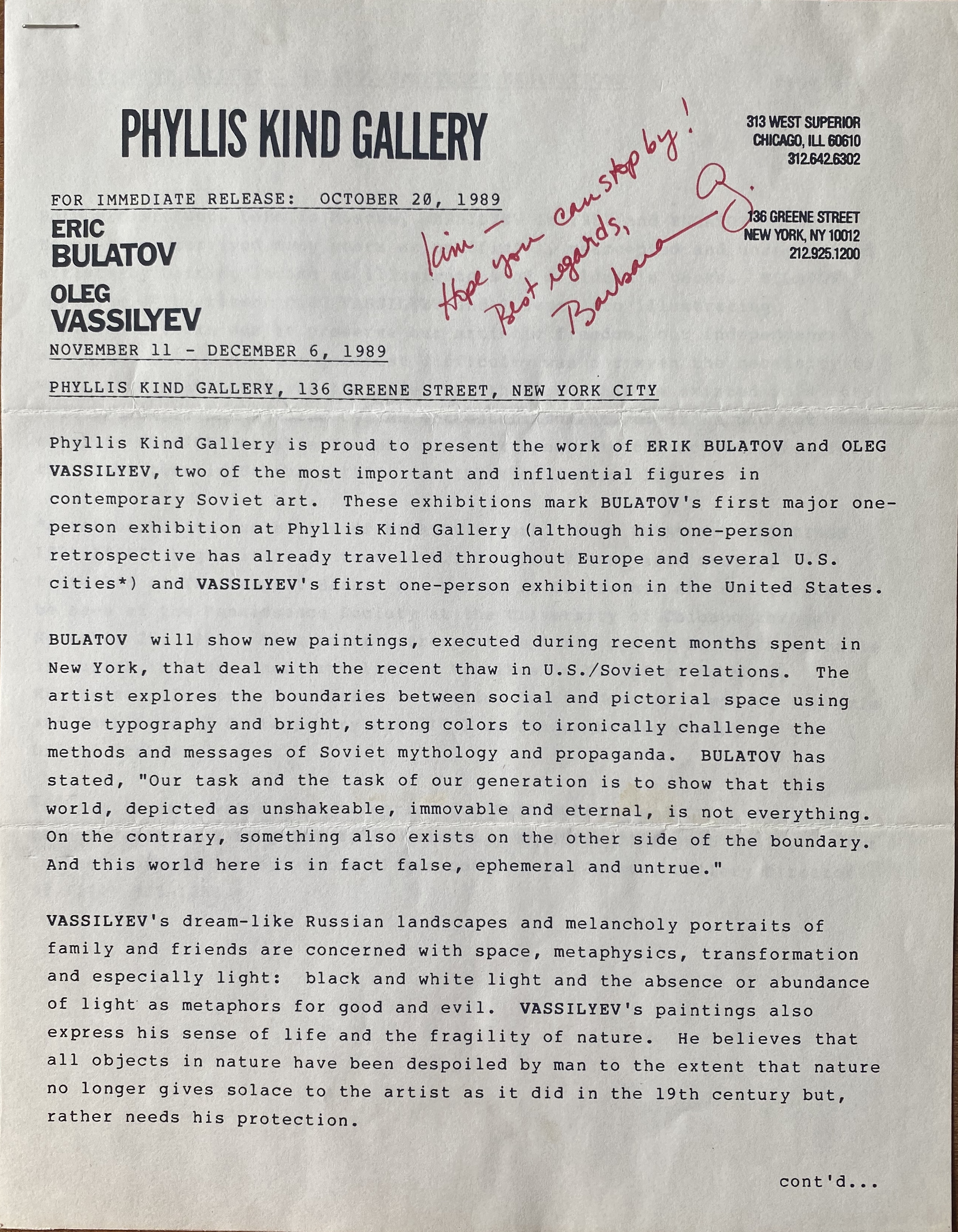 2-page (=sheets) staple din upper left corner, with a brief message to a contemporary art critic, signed “Barbara G.”