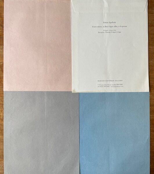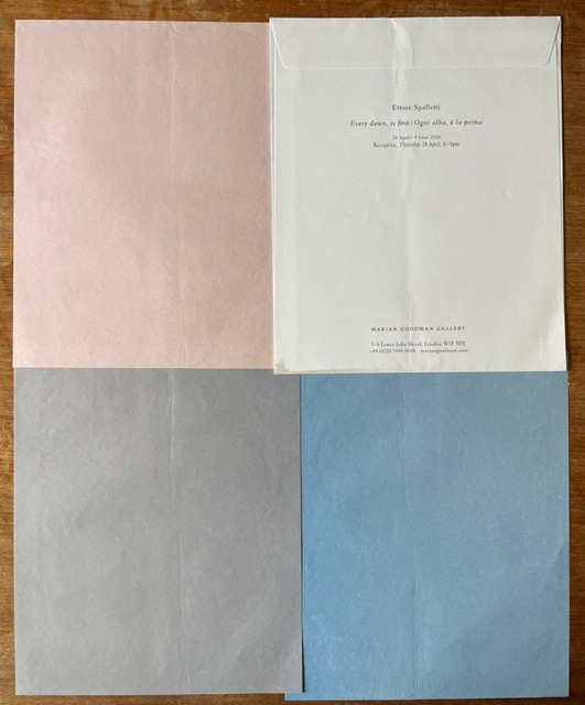 Text on verso of gallery mailing envelope, 9 7/8 x 8″ / 25 x 20.5 cm, containing light blue, pale gray, and lavender sheets, verso blank. 9 9/16 x 7 7/8″ / 24.3 x 20 cm each