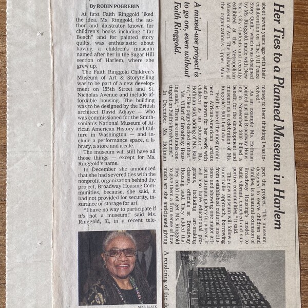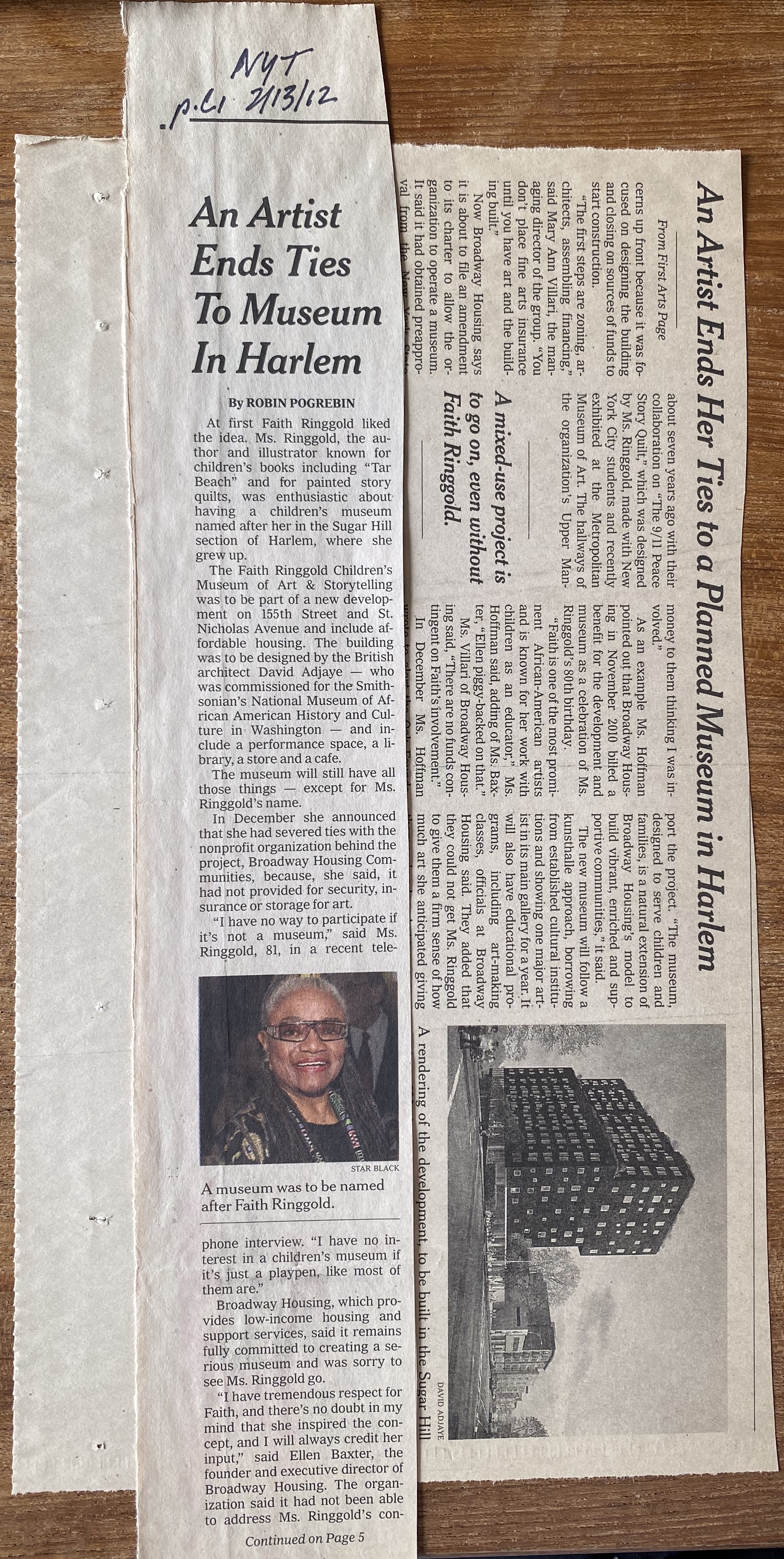– Robin Pogrebin. An Artist Ends Ties To Museum in Harlem. The New York Times. February 13, 2012, pages
