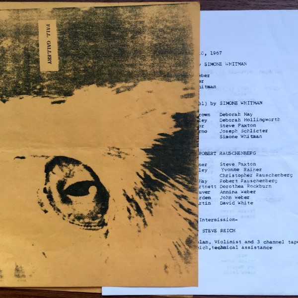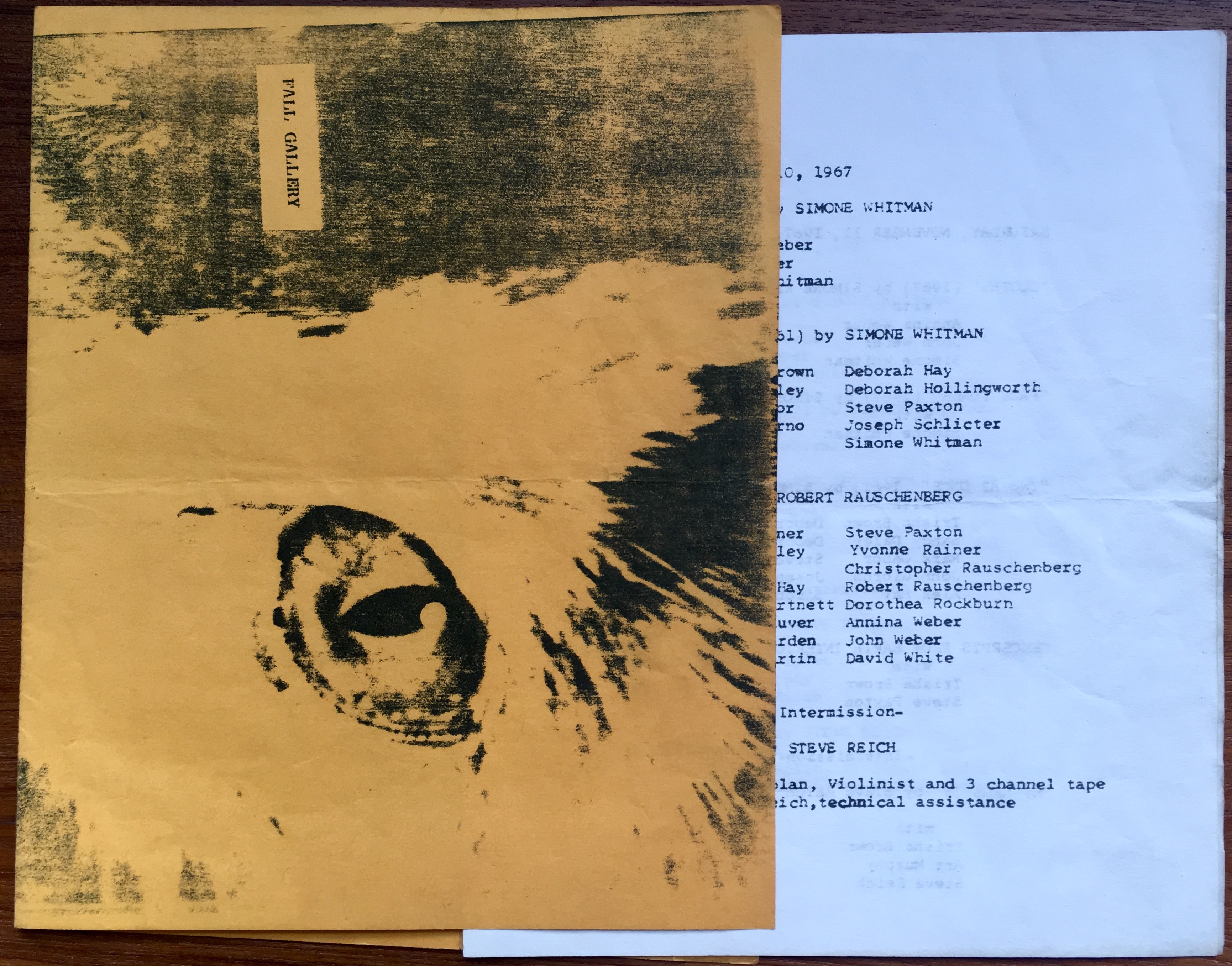 Program, with list of performers, of works by Simone Whitman [now Forti], Robert Rauschenberg, Steve Reich, and Steve Paxton