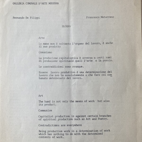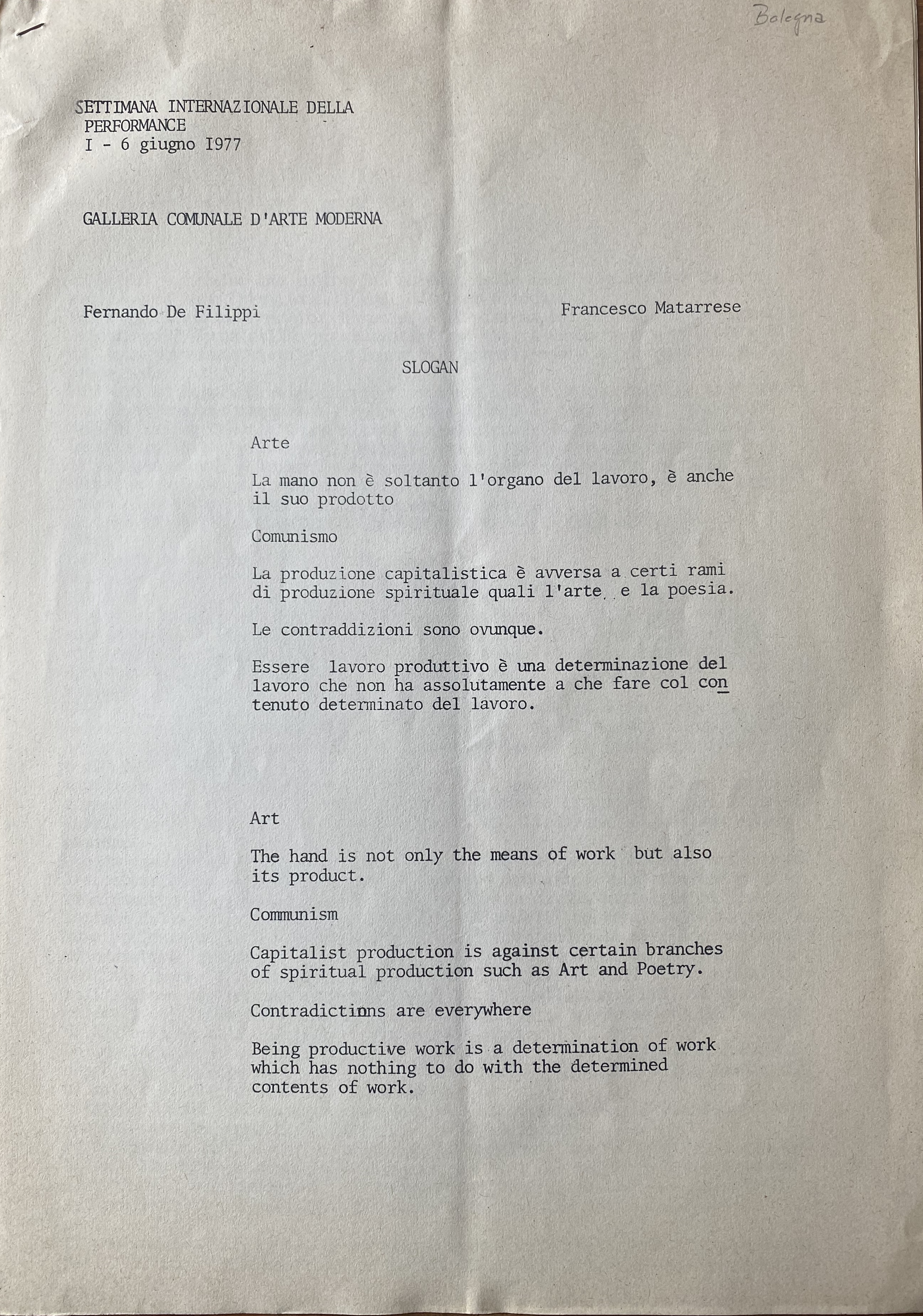 Fernando De Filippi. Ideologia. Settimana internazionale della performance. Galleria Communale d’arte moderna, 1-6 giugno 1977. 2 pages (=sheets)