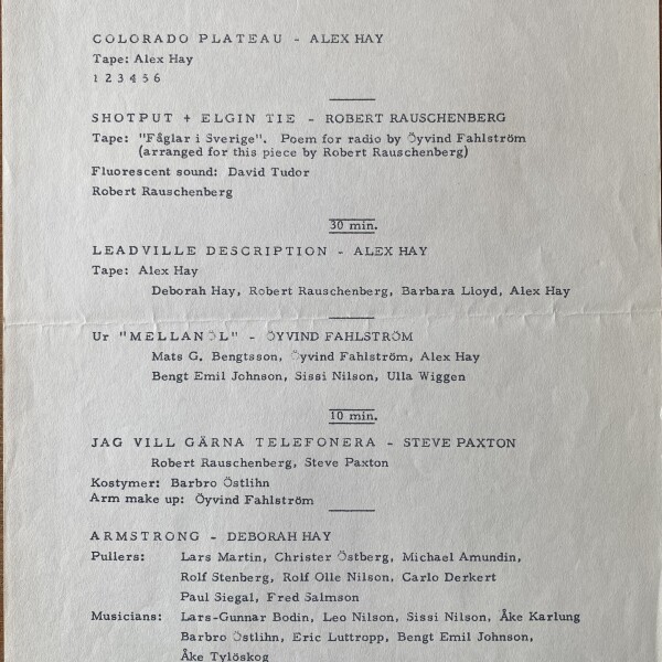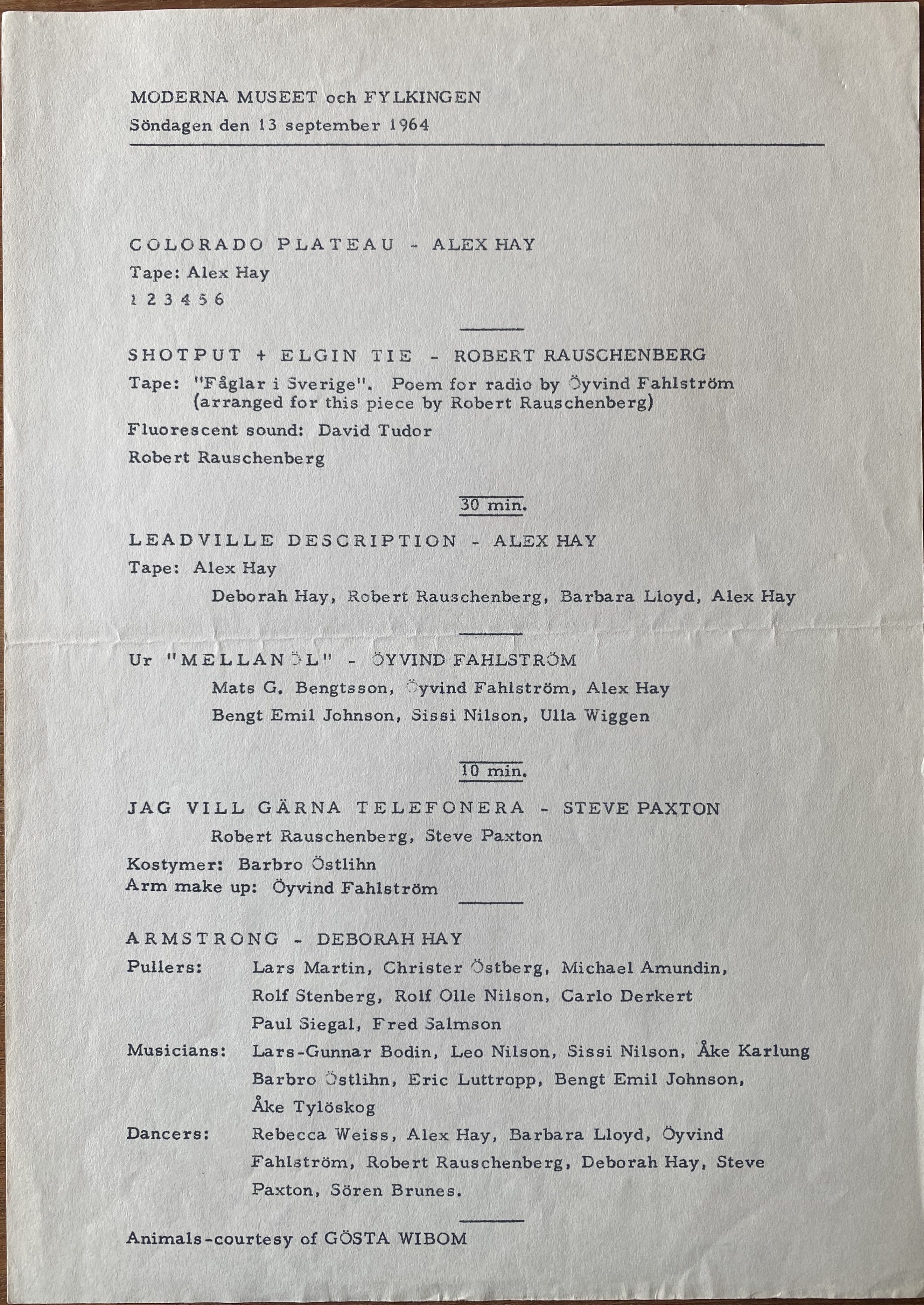 Robert Rauschenberg (only performance of Elgin Tie), Alex Hay, Oyvind Fahlström, Steve Paxton, and Deborah Hay