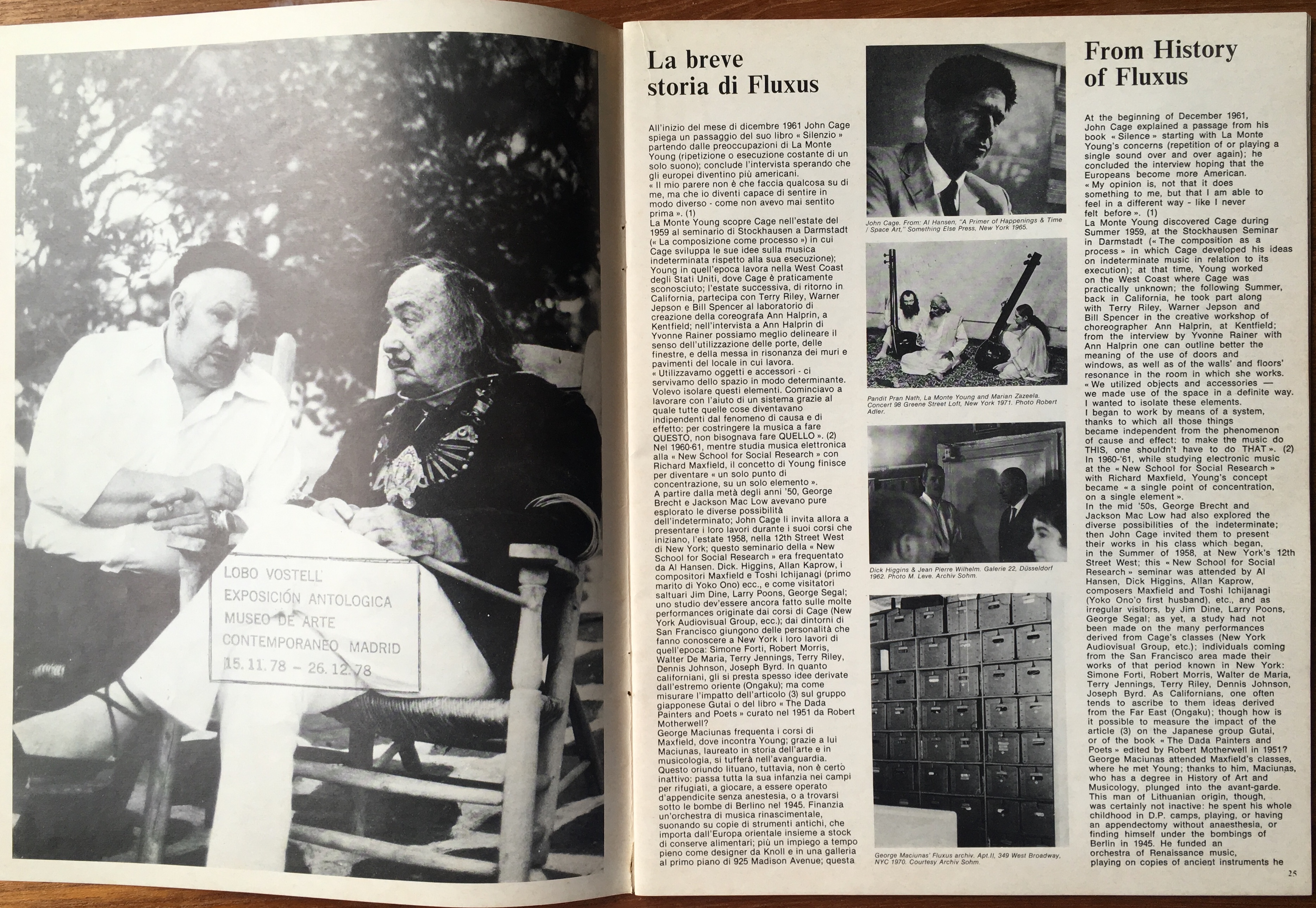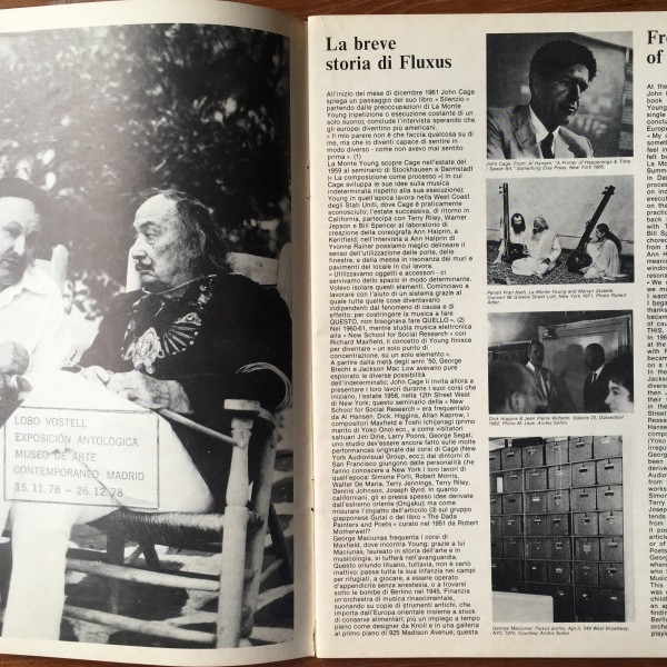 Text in English and Italian. From History of Fluxus by Charles Dreyfuss; On Fluxus by Ken Friedman; Some Thoughts on the Context of Fluxus by Dick Higgins; interviews of Giuseppe Chiari by Helena Kontova, and of Jean-Jacques Ledel by Bernard Blistène; April 13, 1978 letter from George Maciunas to Rosanna Chiesi; contributions by Eric Andersen, George Brecht, Robert Filliou, Henry Flynt, Peter Frank, Ray Johnson, Alison Knowles, Nam June Paik, Takako Saito, Tomas Schmit, Wolf Vostell, Ben Vautier, Robert Whitman (misspelled Whitmann). 65 illustrations