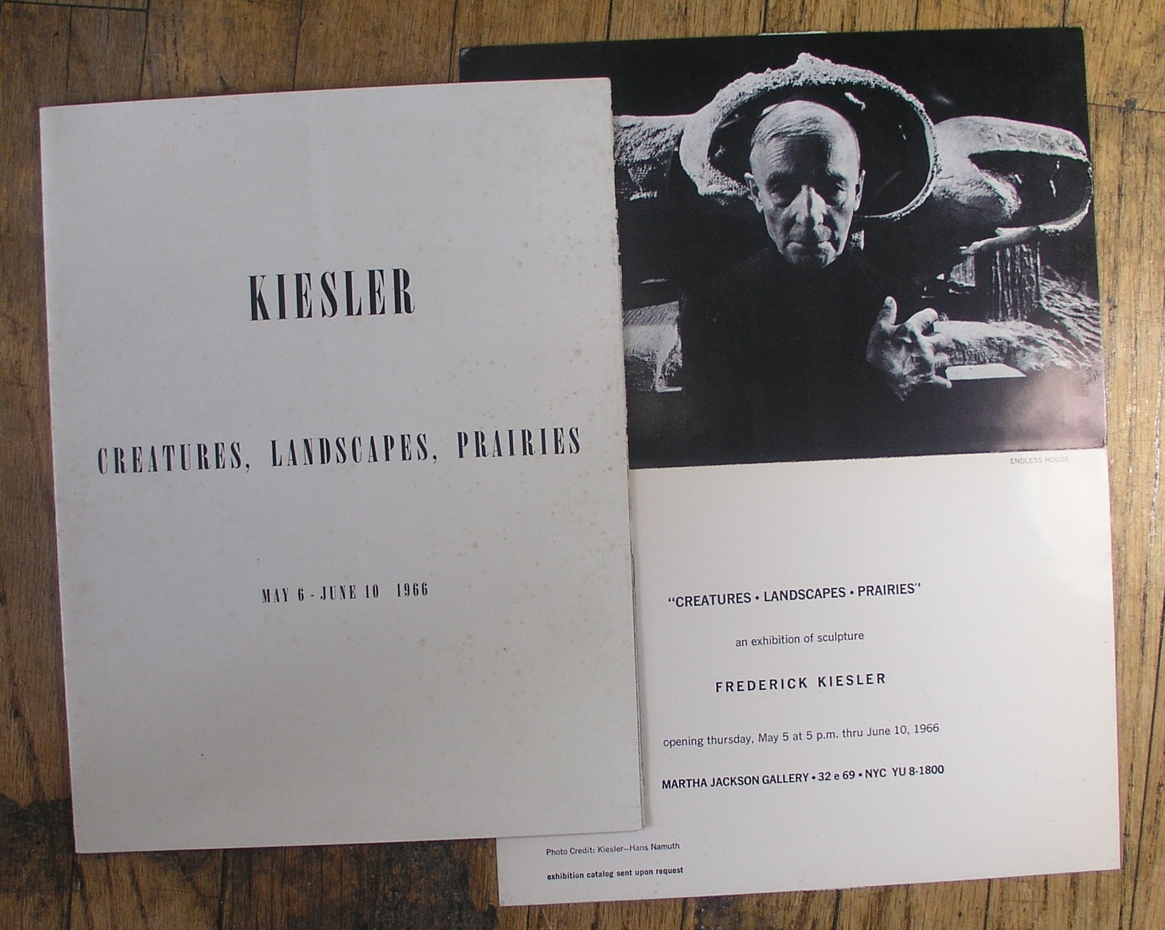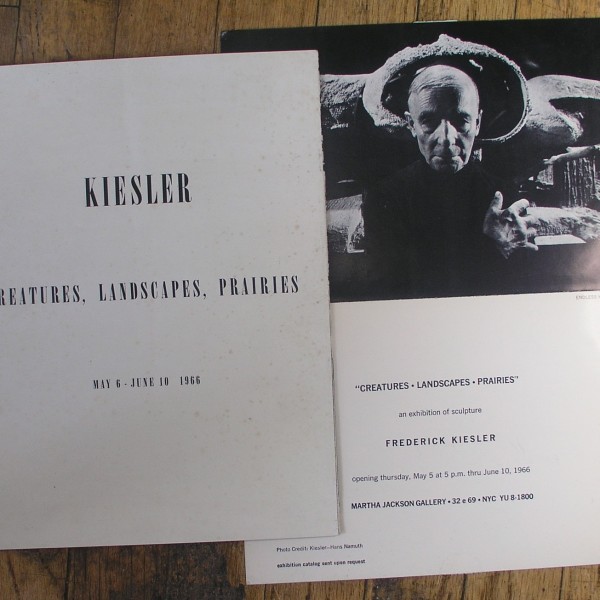 With: Frederick Kiesler. “Creatures, Landscapes, Praries;” an exhibition of sculpture. Martha Jackson Gallery, New York, May 5–June 10, 1966. Exhibition announcement. Folder (=4 pages) 6 5/16 x 9 1/4” / 15.9 x 23.5 cm. Photo portrait by Hans Namuth, photo graph of Regular Success by John D. Schiff, to whom the announcement was mailed