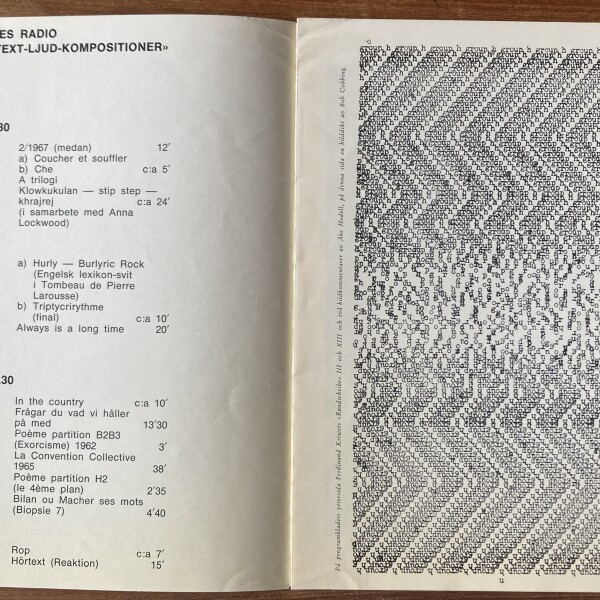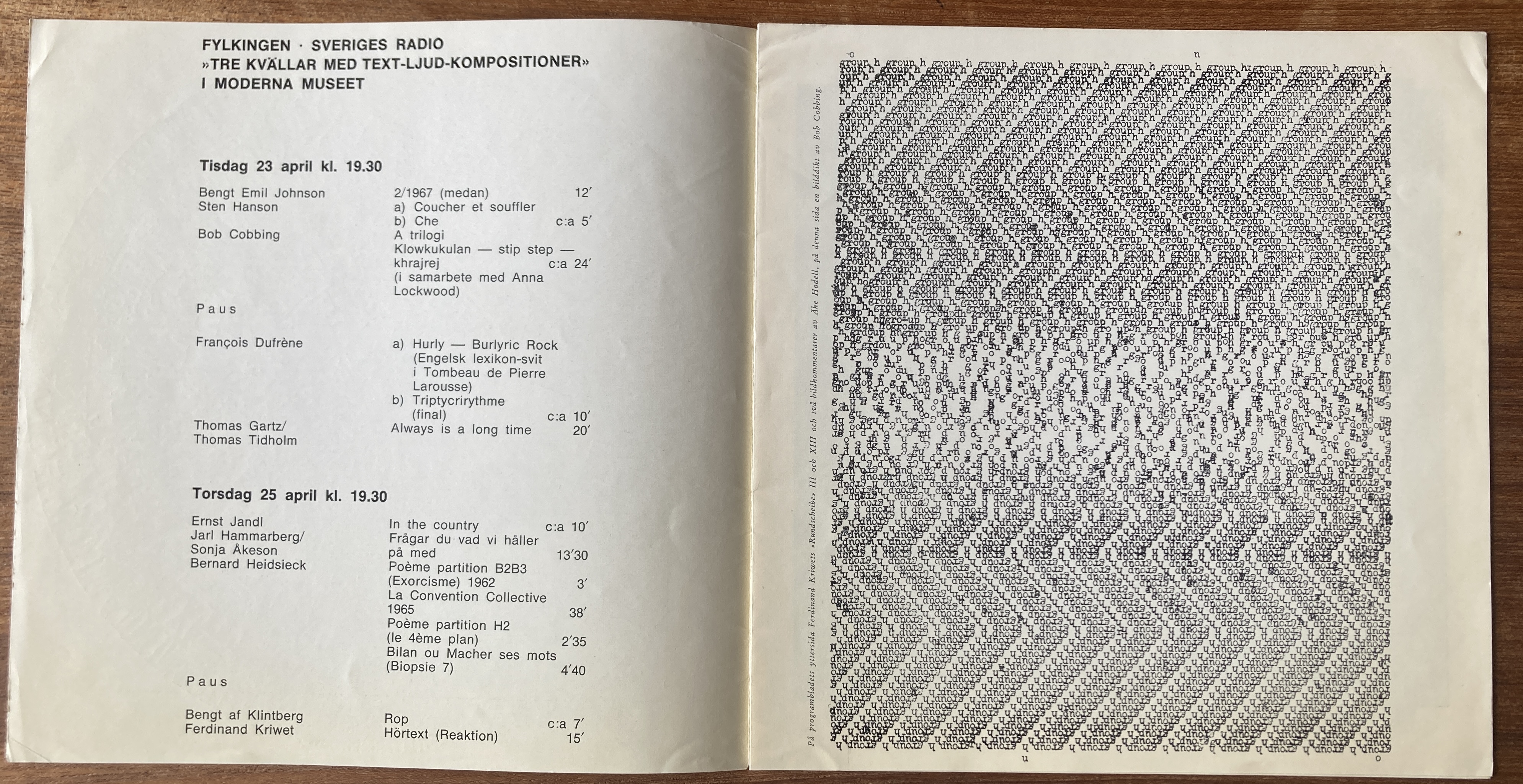 Fylkingen. Sveriges Radio. “Tre kvälar med text-ljud-kompositioner”. Moderna Museet, [Stockholm], 23, 25, 26, april [1968]