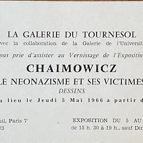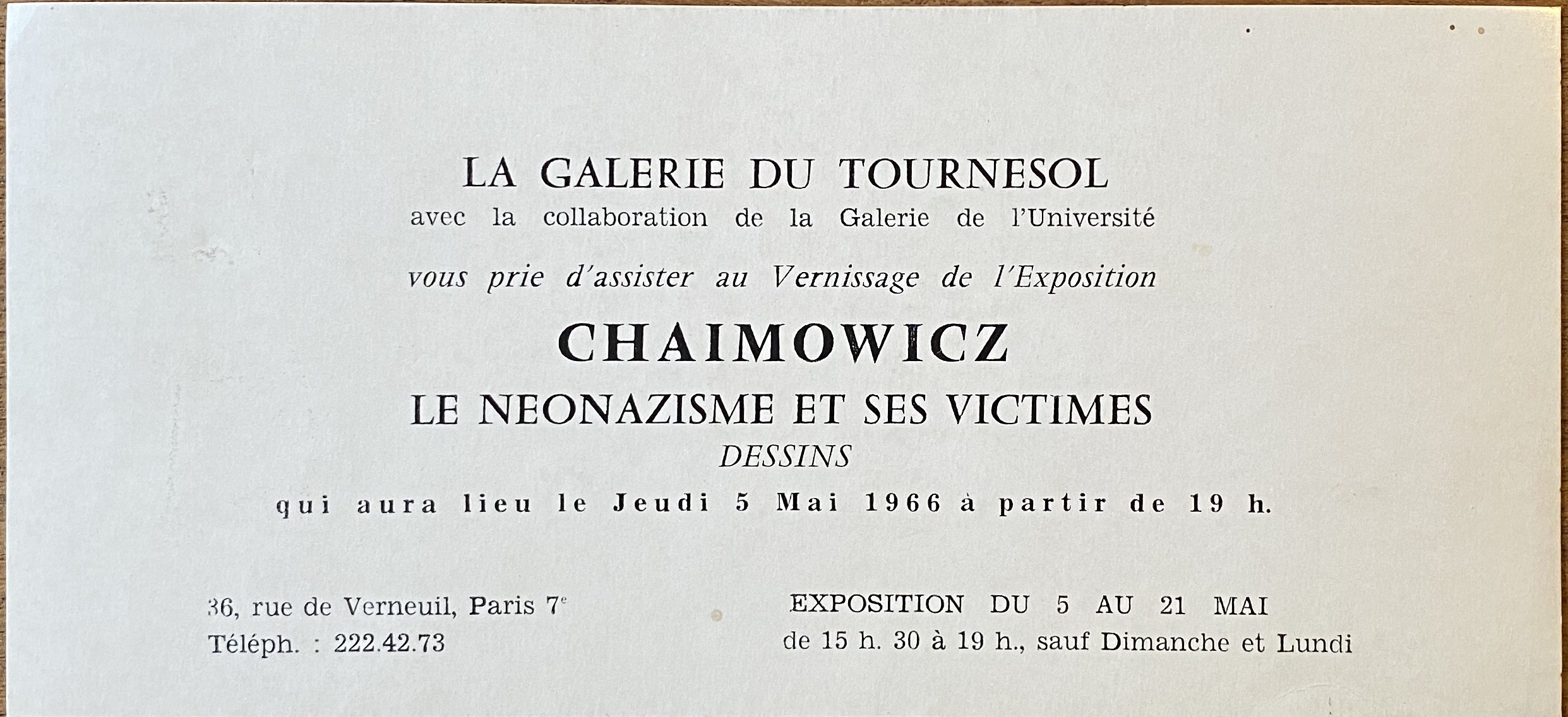 George Chaimowicz. Le neonazisme et ses victimes. Dessins. Galerie du Tourne sol, Paris, 5-21 mai 1966