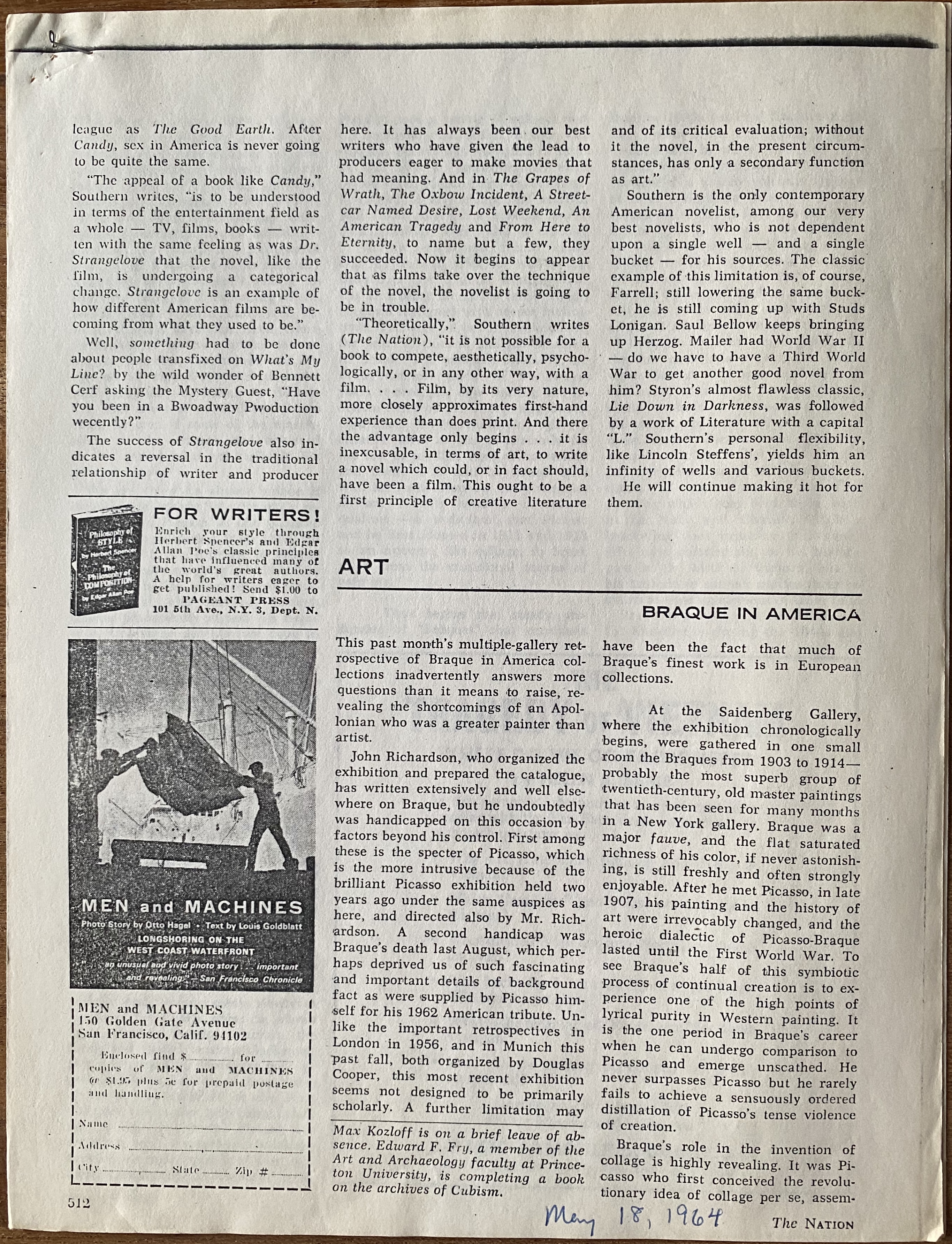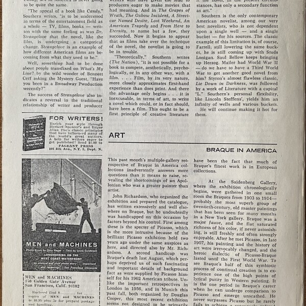 (Georges Braque). Edward Fry. Braque in America. The Nation. May 18, 1964. Clipping