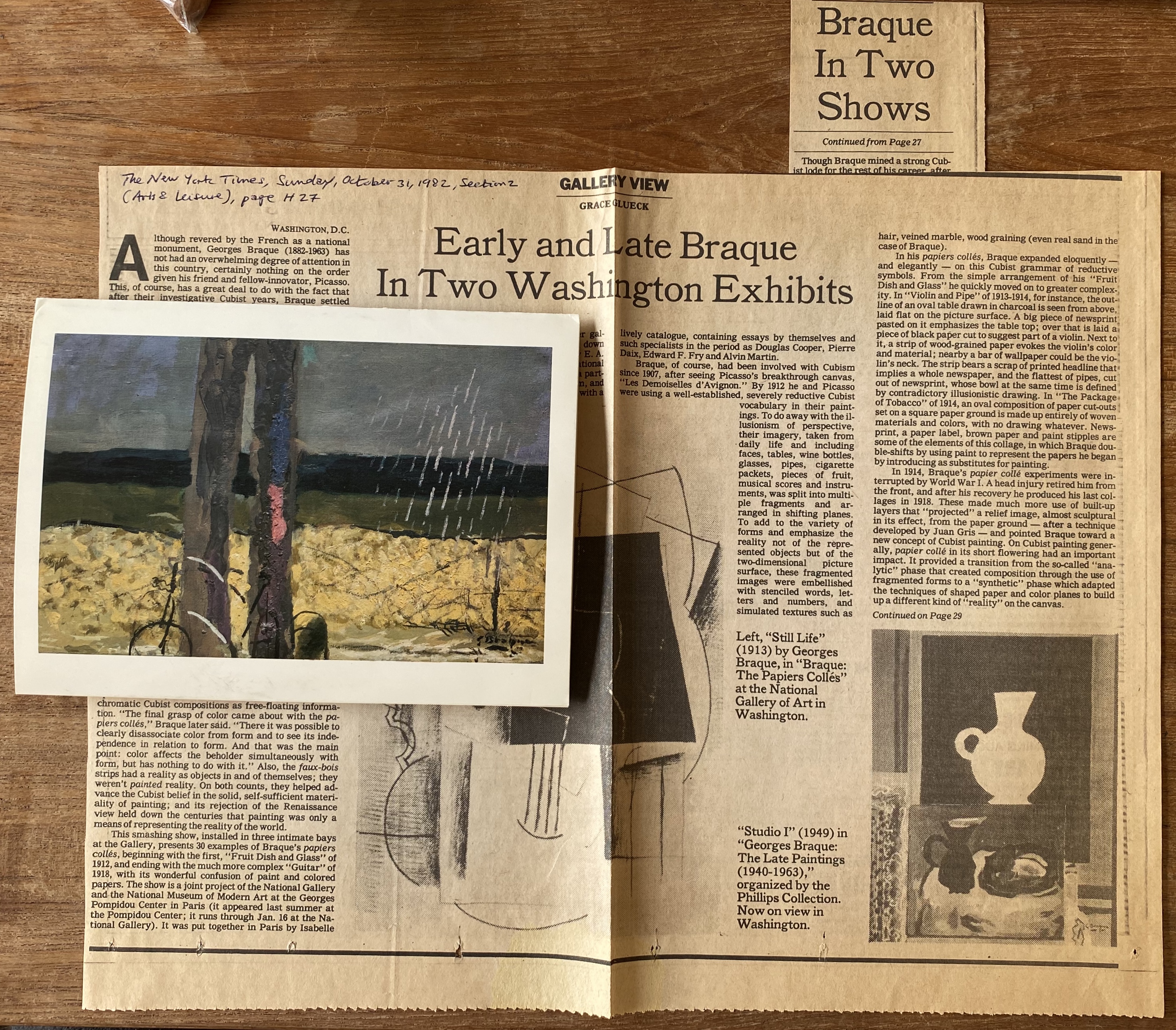 Grace Glueck. Early and Late Braque in Two Washington Exhibits. The New York Times. October 31, 1982, pages H27 and H29