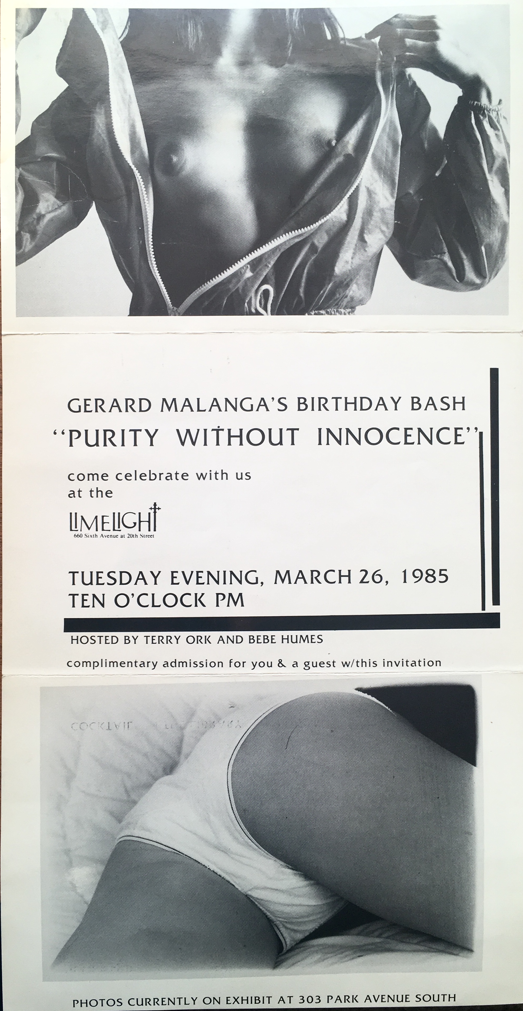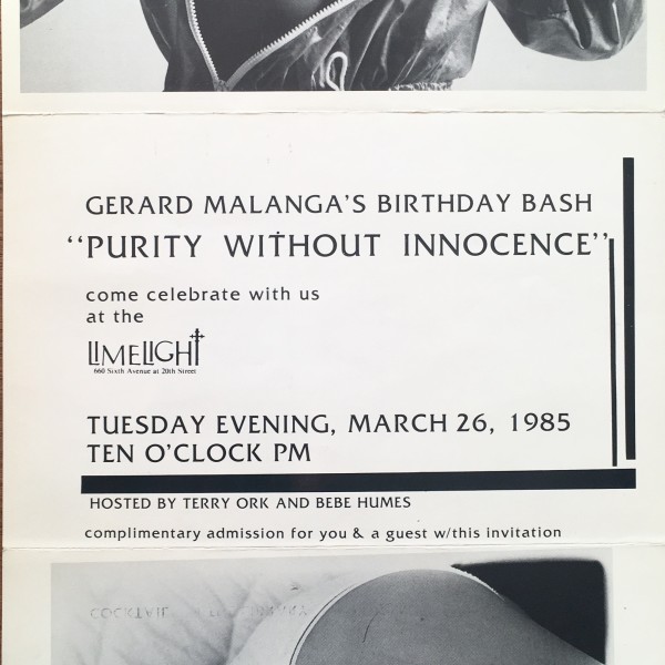 (Gerard Malanga). Gerard Malanga’s birthday bash / “Purity without innocence.” Limelight, [New York], March 26, 1985. Hosted by Terry Oak and Bebe Humes