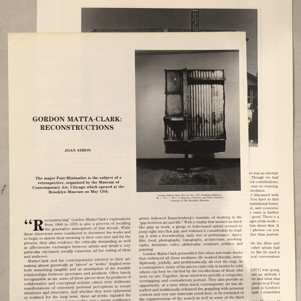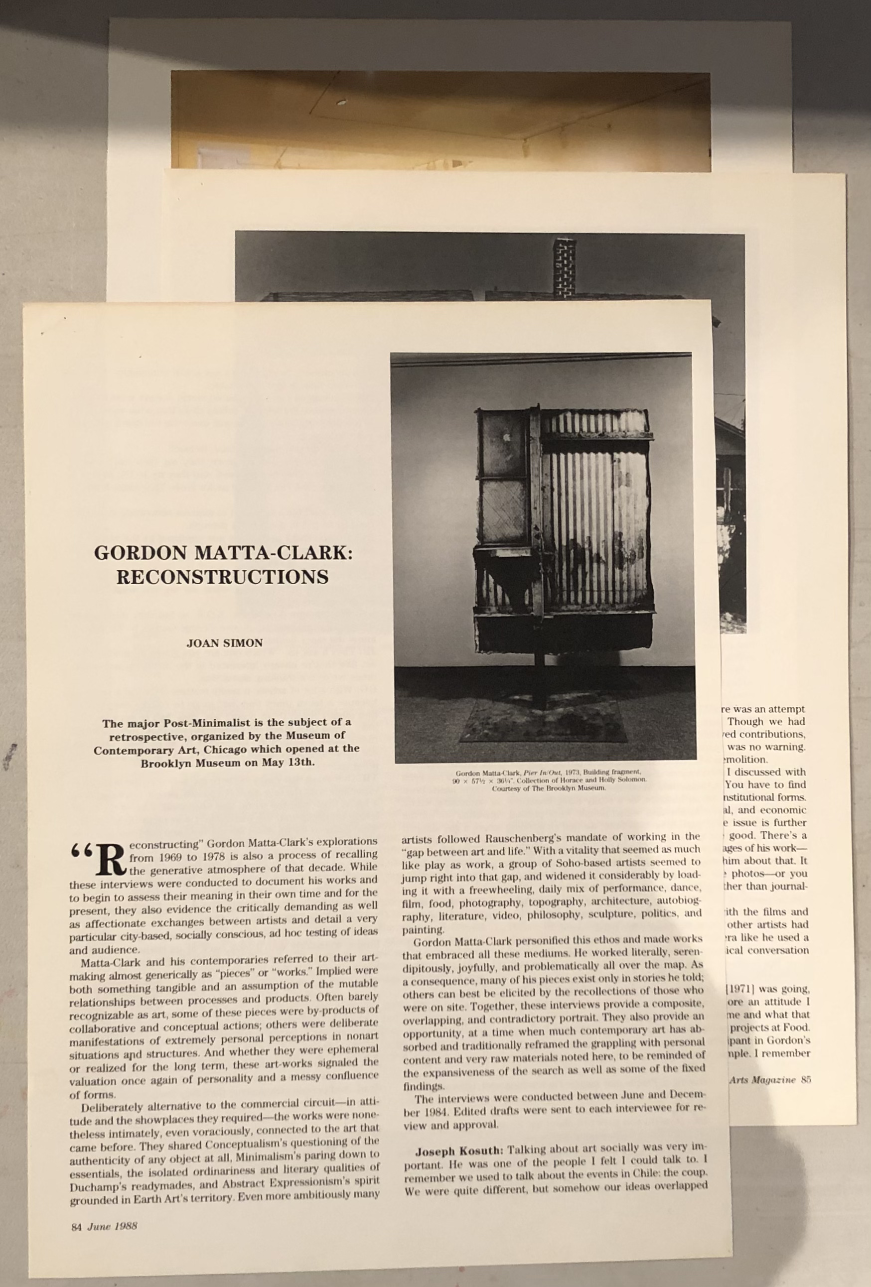 (Gordon Matta-Clark). Joan Simon. Gordon Matta-Clark: Reconstructions. Arts Magazine, June 1988.