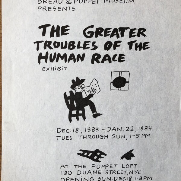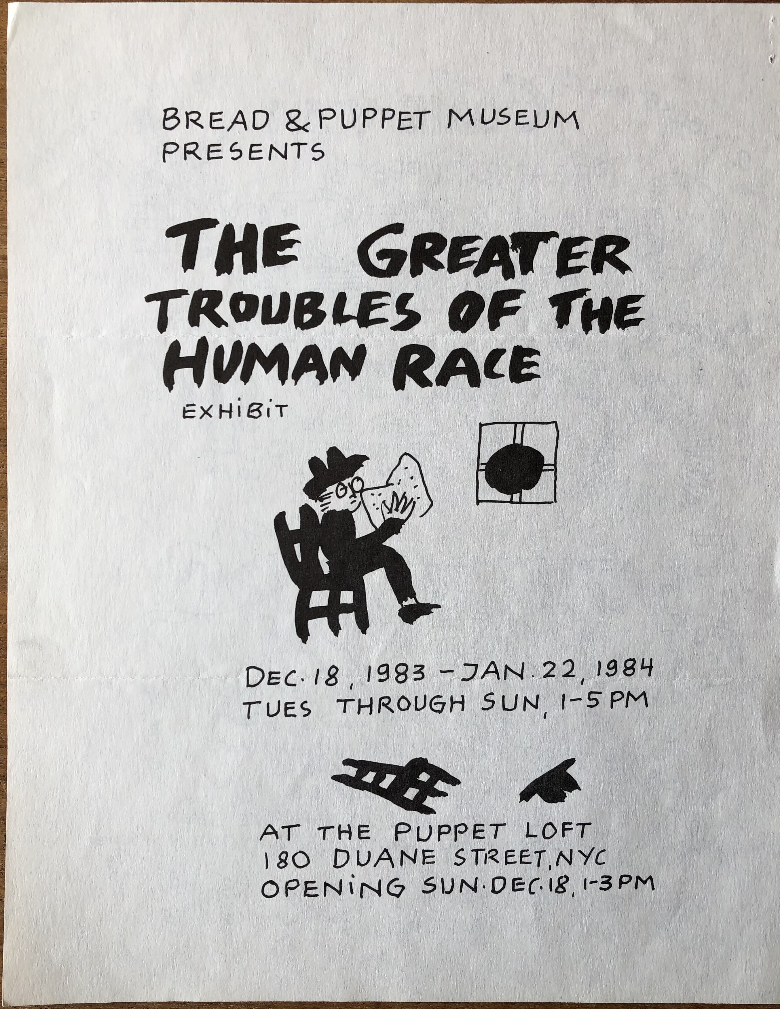 (Bread & Puppet). Bread & Puppet Museum presents: The Greater Troubles of the Human Race. Exhibit at the Puppet Loft, 180 Duane Street, New York, December 18, 1983 – January 22, 1984