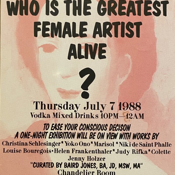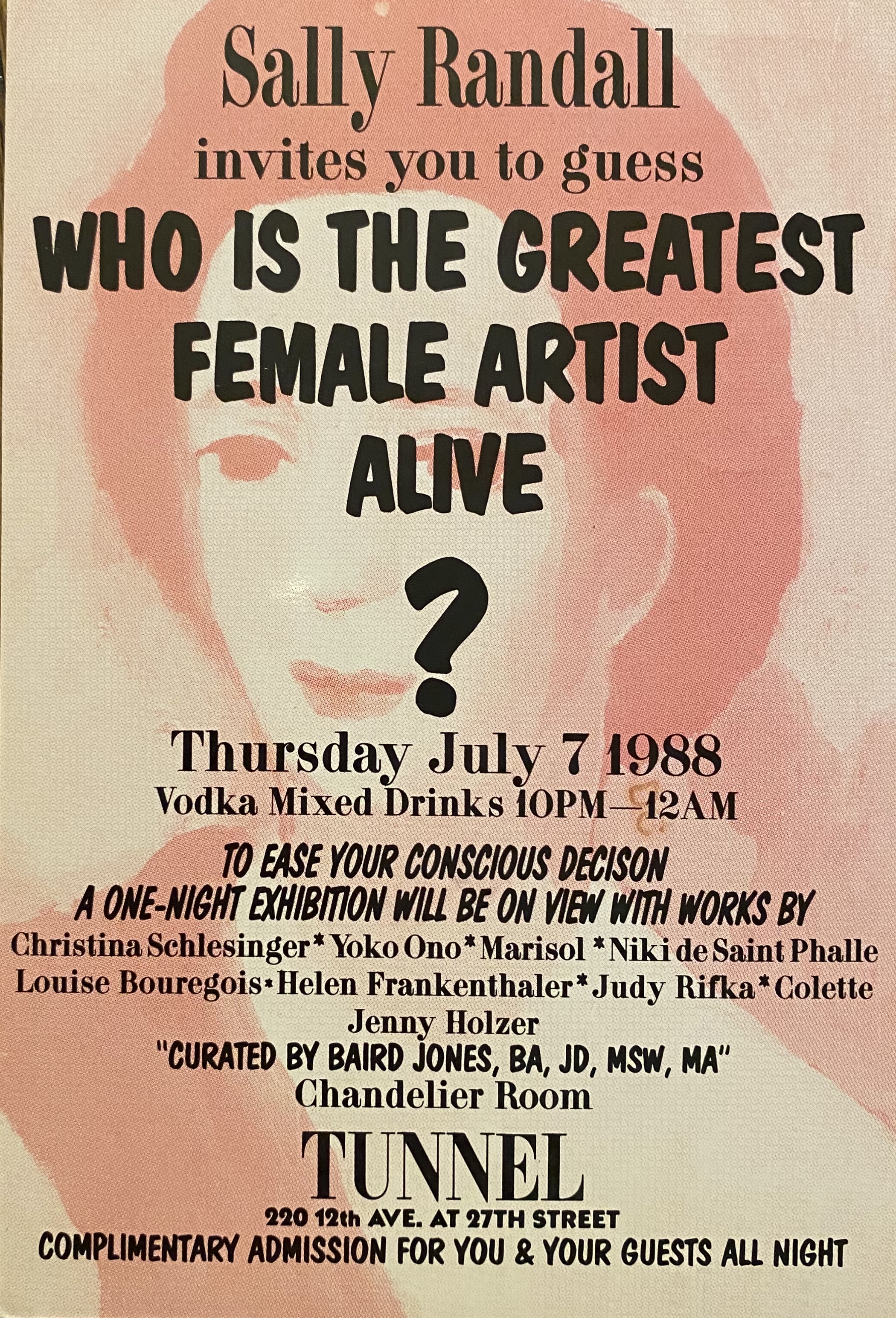 Who Is the Greatest Female Artist Alive? Curated by Baird Jones. Tunnel, [New York], July 7, 1988