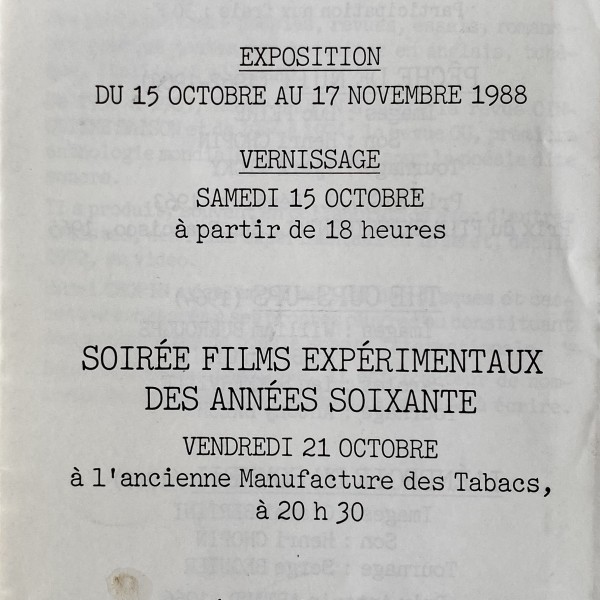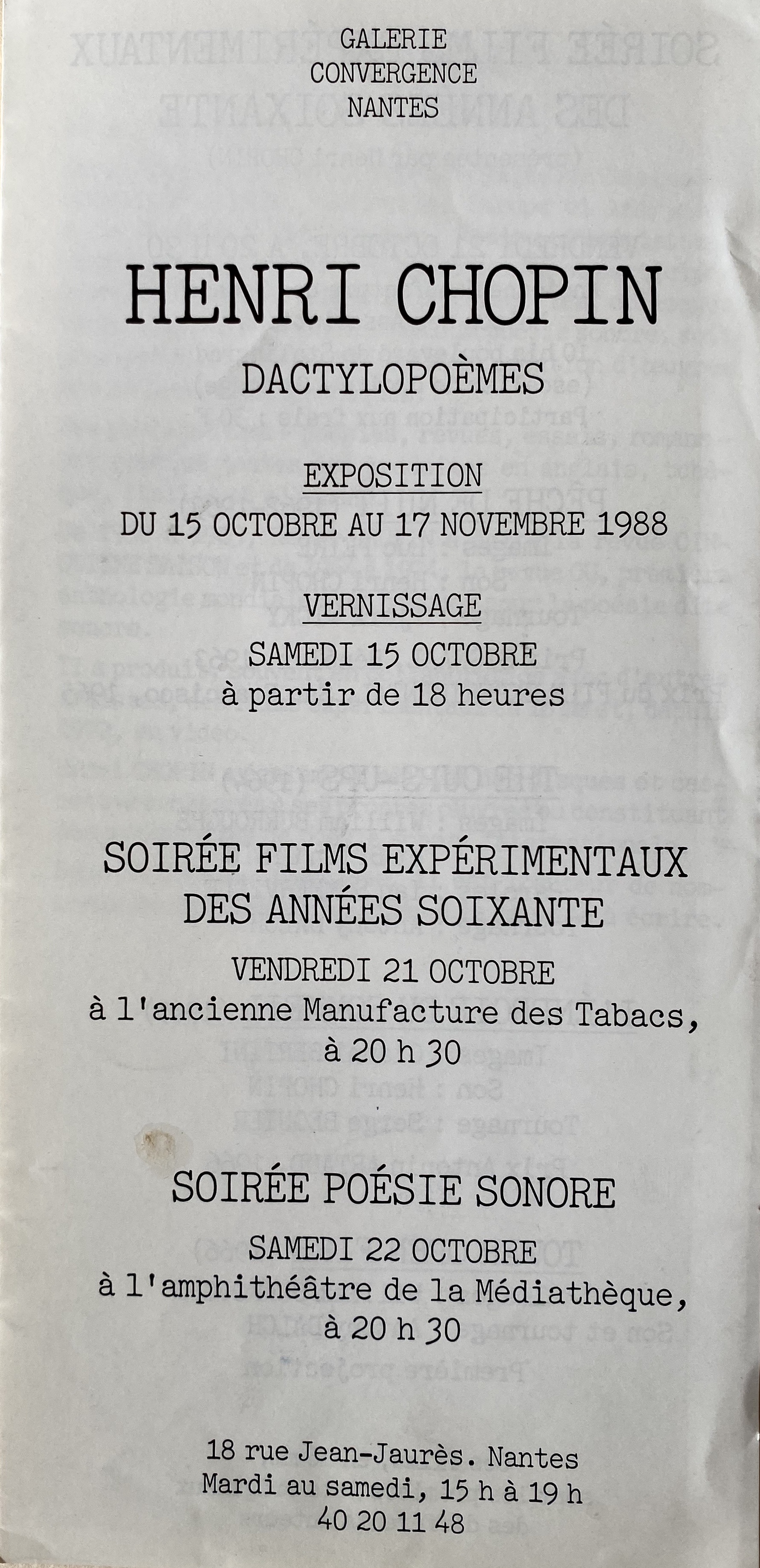 (Henri Chopin). Henri Chopin. Dactylopoèmes. Galerie Convergence, Natex, 15 octobre – 17 novembre 1988 / Soirée films expérimentaux des années soixante. Ancienne Manufacture des Tabacs, 21 octobre / Soirée poésie sonore. Amphithéâtre de la Médiathèque, 27 octobre