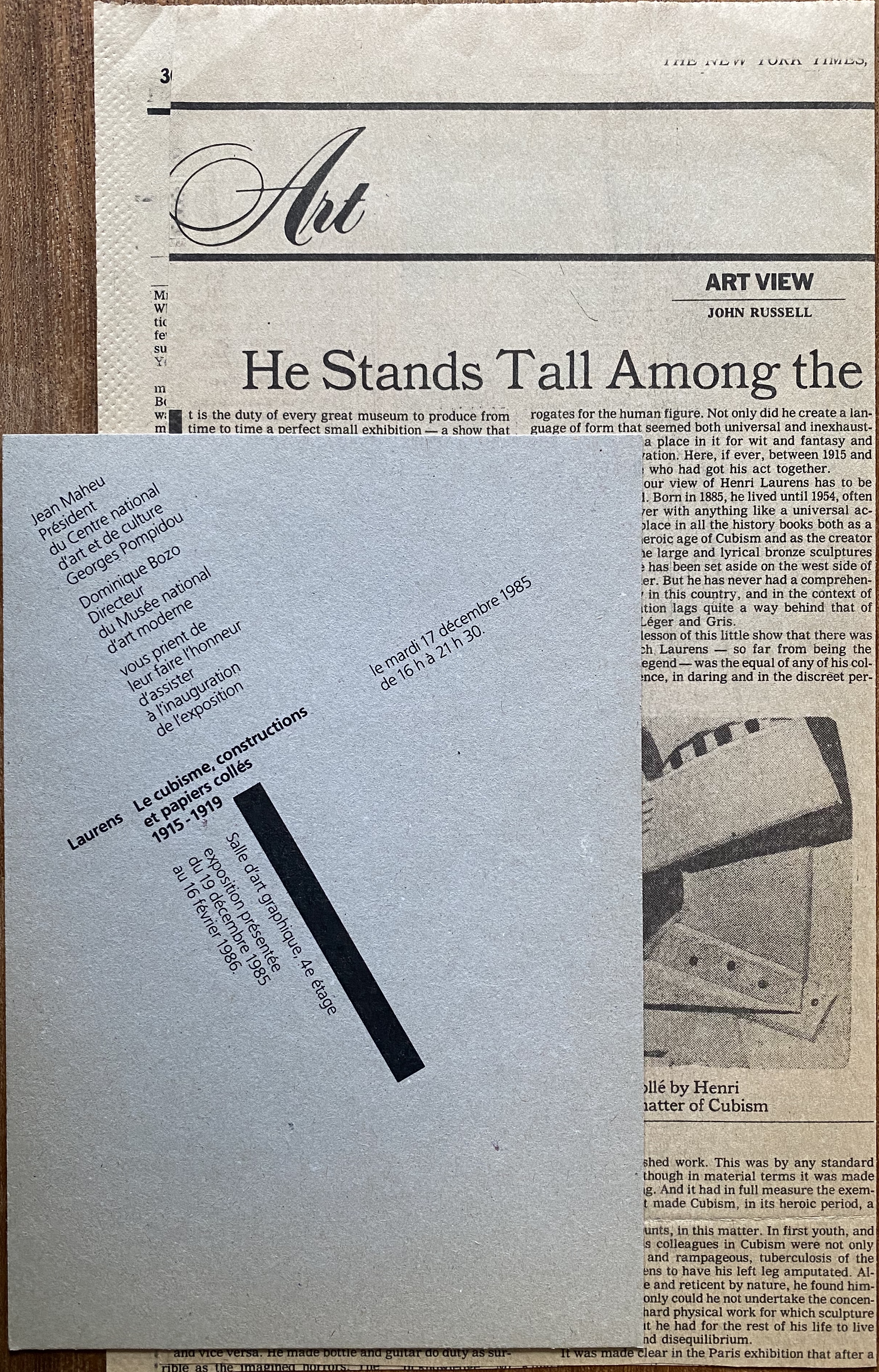 (Henri Laurens). Laurens: Le cubisme, constructions et papiers collés, 1915-1919. Centre national d’art et de culture Georges Pompidou, 17 décembre 1985