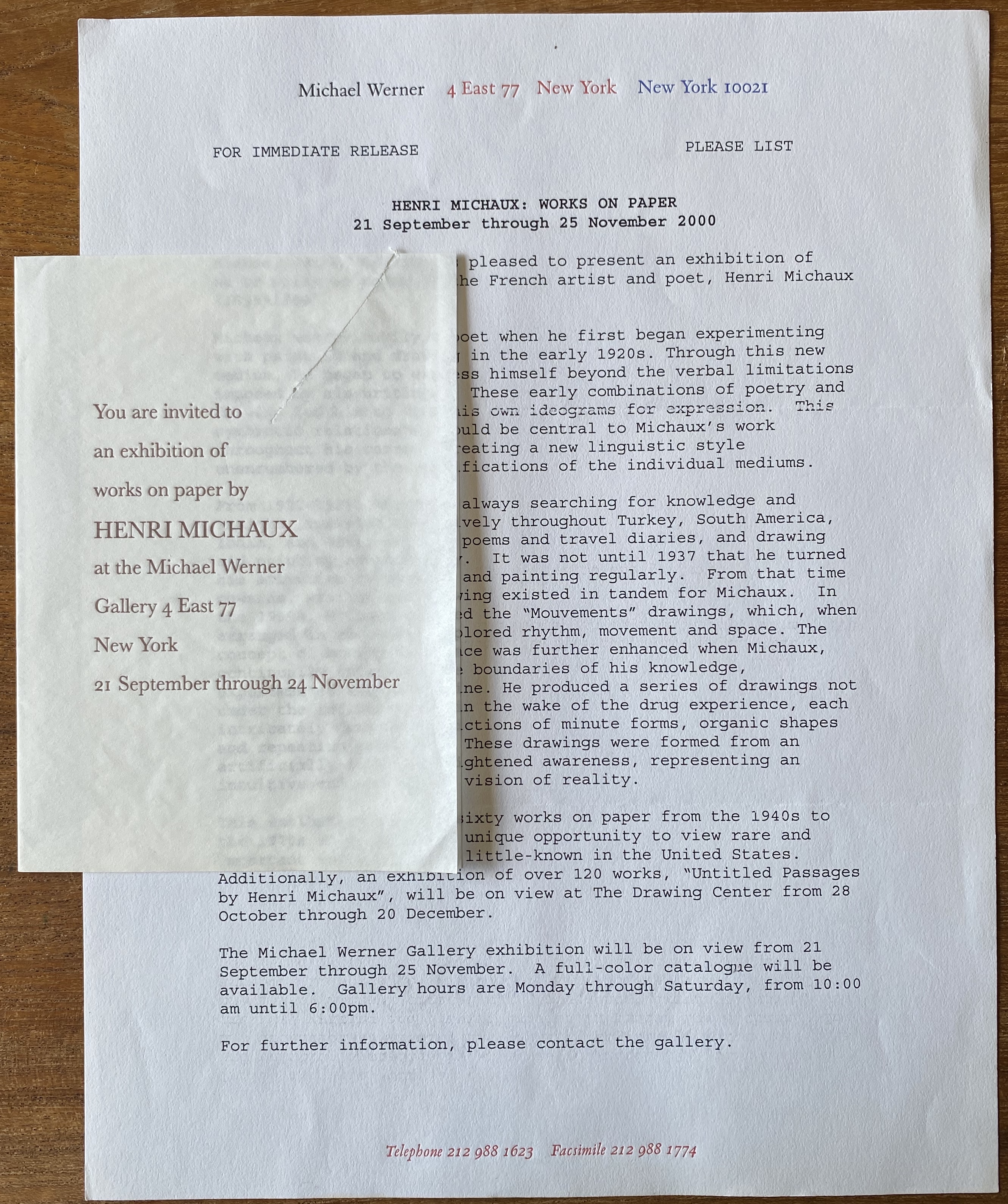 (Henri Michaux). … exhibition of works on paper by Henri Michaux. Michael Werner Gallery, New York, 21 September – 25 November 2000