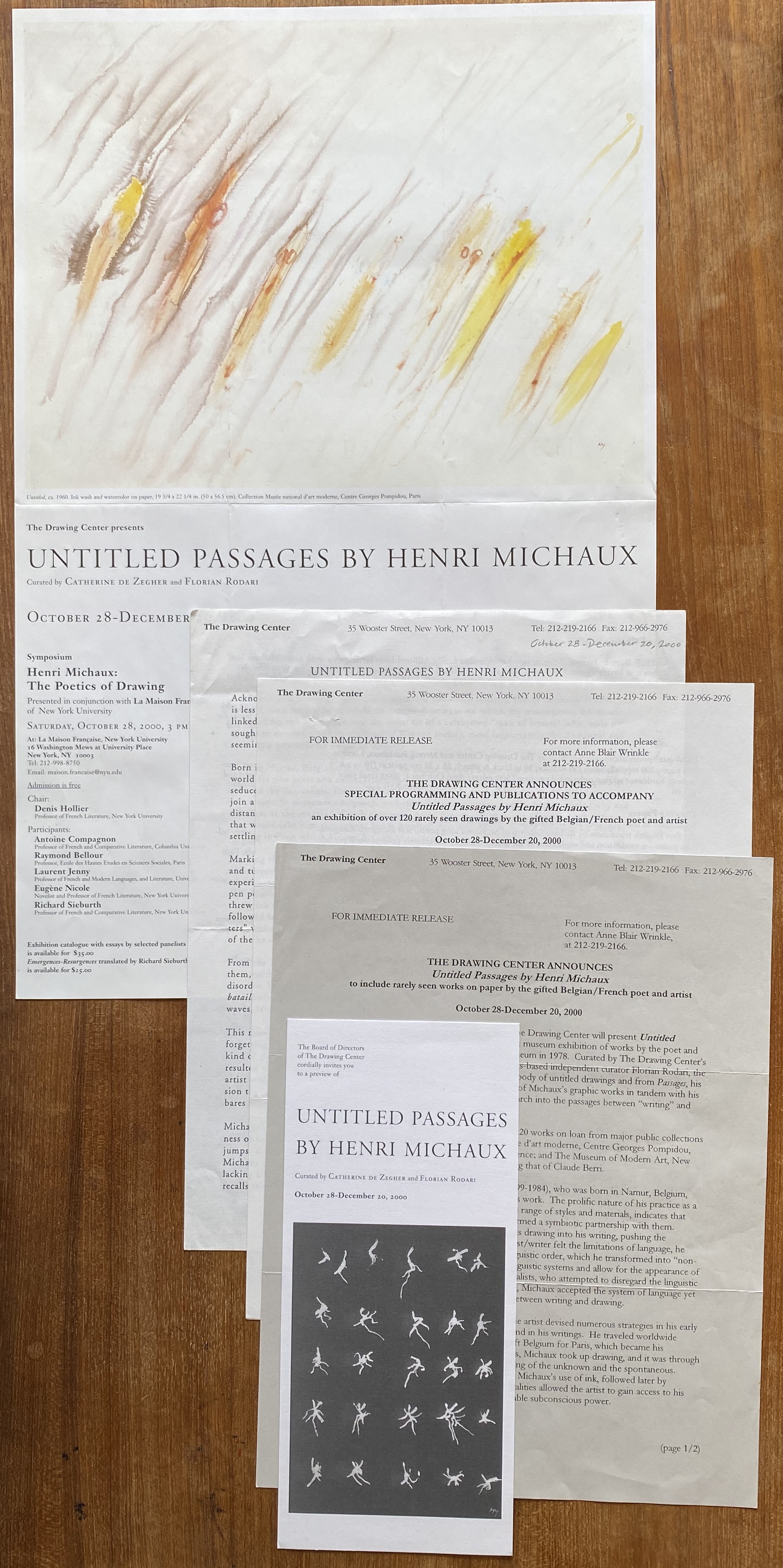 (Henri Michaux). Untitled Passages by Henri Michaux. The Drawing Center, New York, October 28 – December 20, 2000