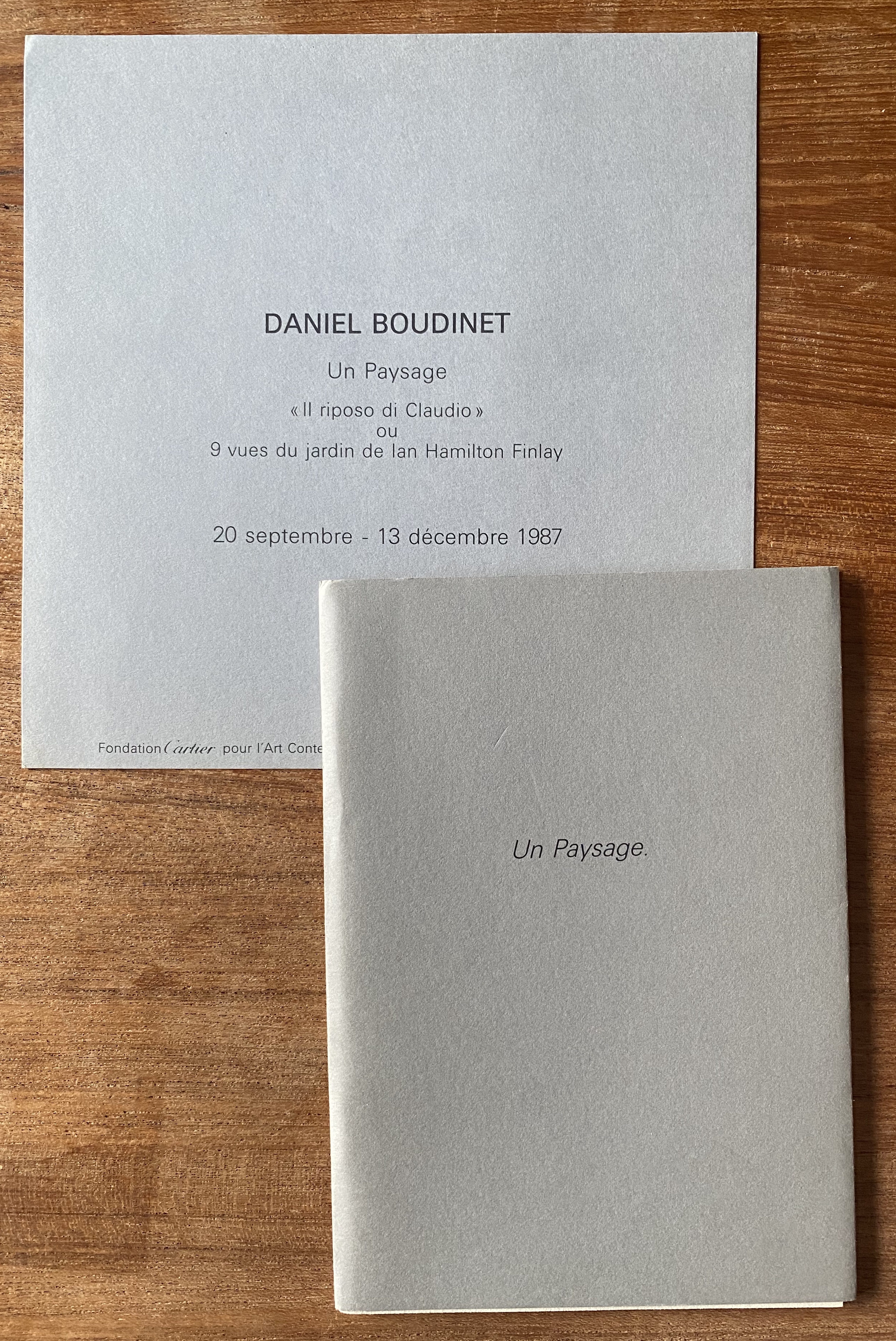 Daniel Boudinet. Un Paysage. “Il riposo di Claudio,” ou 9 vues du jardin de Ian Hamilton Finlay. Fondation Cartier pour l’Art Contemporain, Jouy-en-Josas, 20 sptembre – 13 décembre 1987