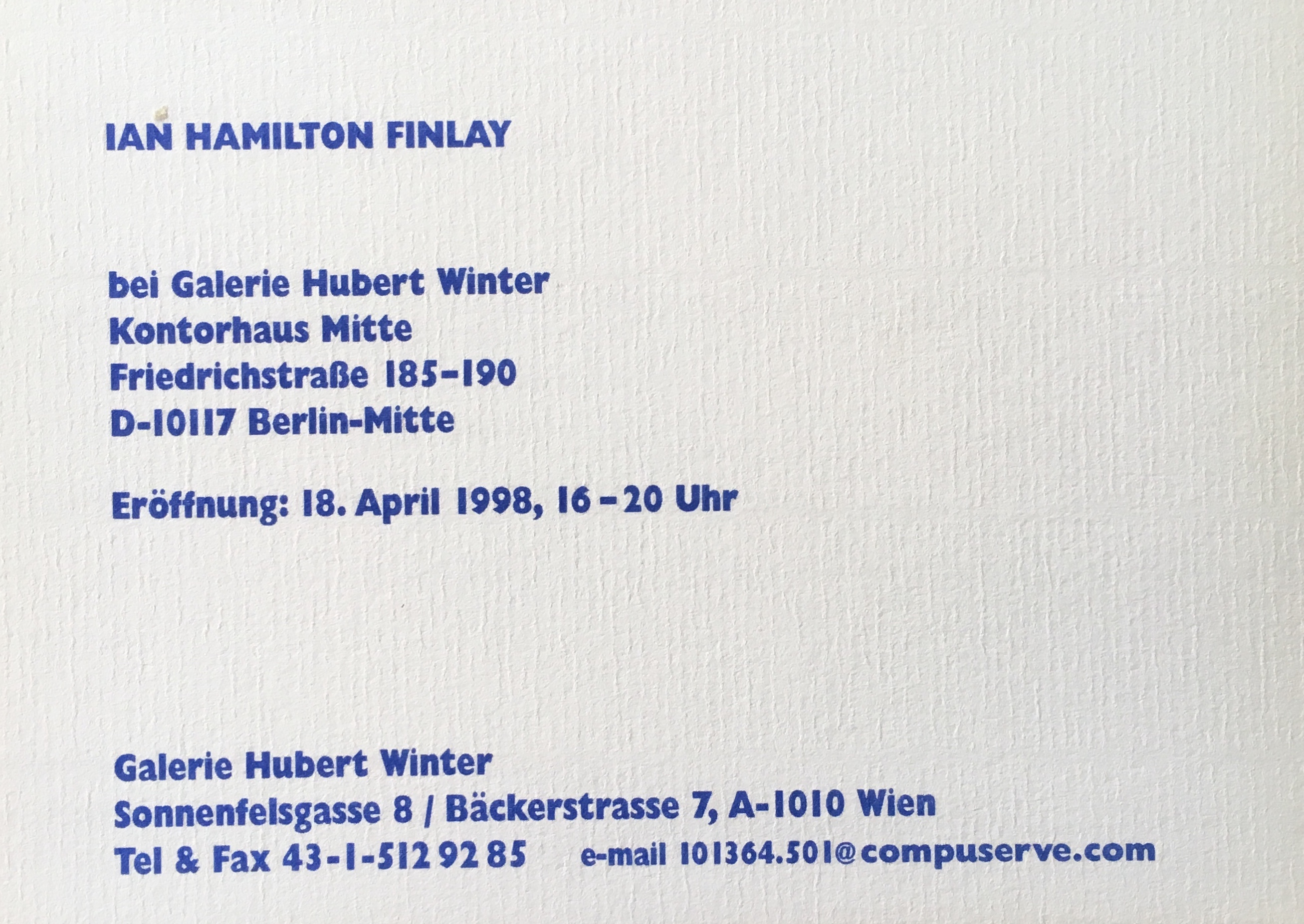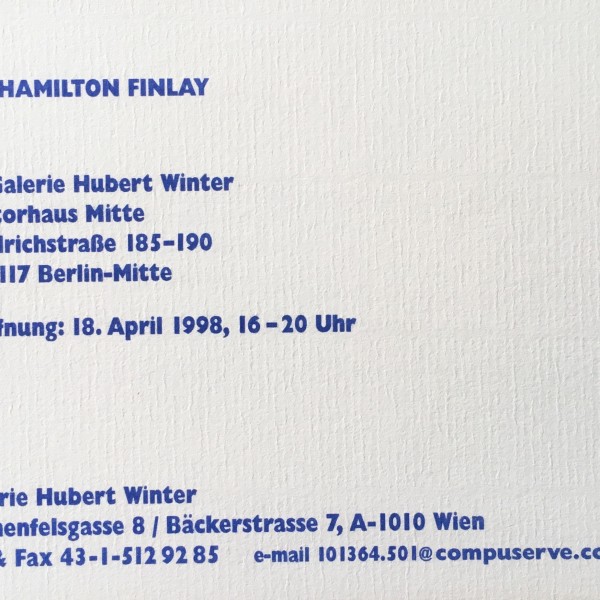 (Ian Hamilton Finlay). Ian Hamilton Finlay. Galerie Hubert Winter, Berlin. Eröffnung 18. April 1998