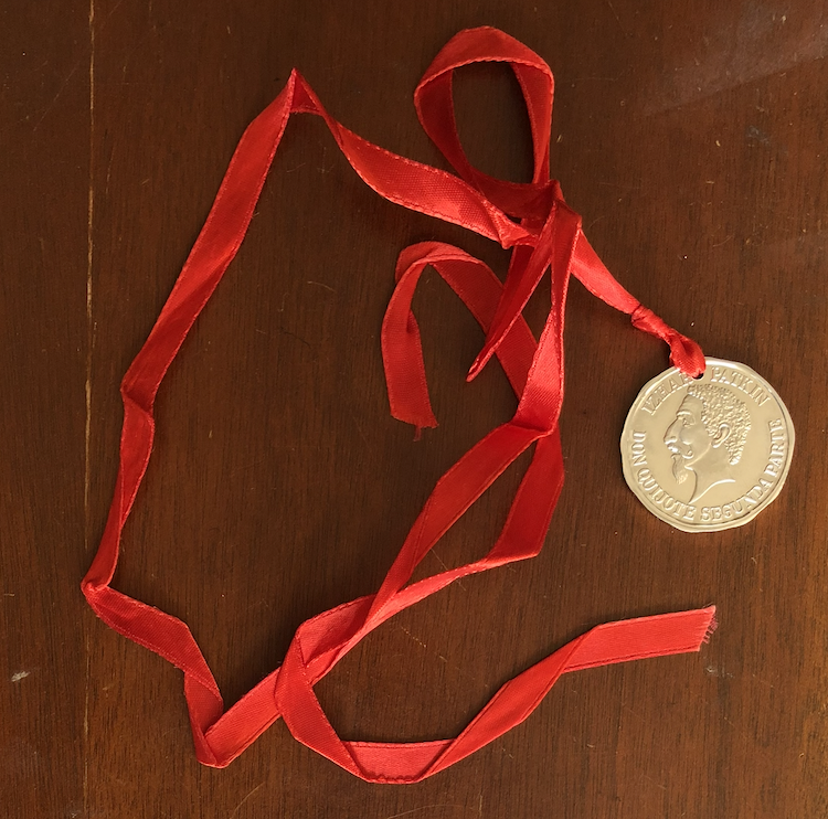 An embossed metal coin with a red silk ribbon