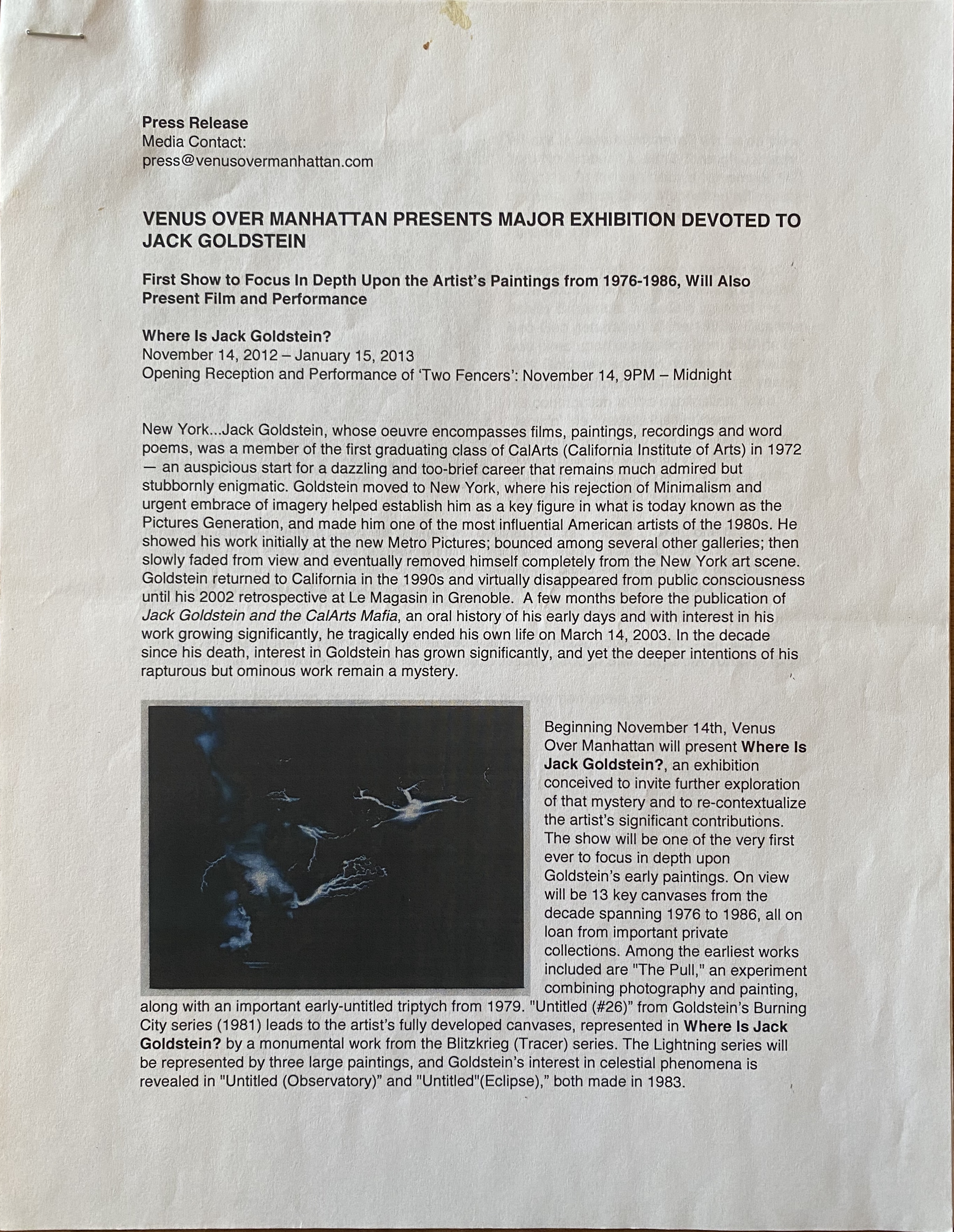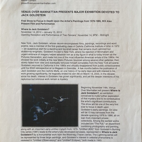 (Jack Goldstein). Where Is Jack Goldstein. Venus Over Manhattan, New York, November 14, 2012 – January 15, 2013