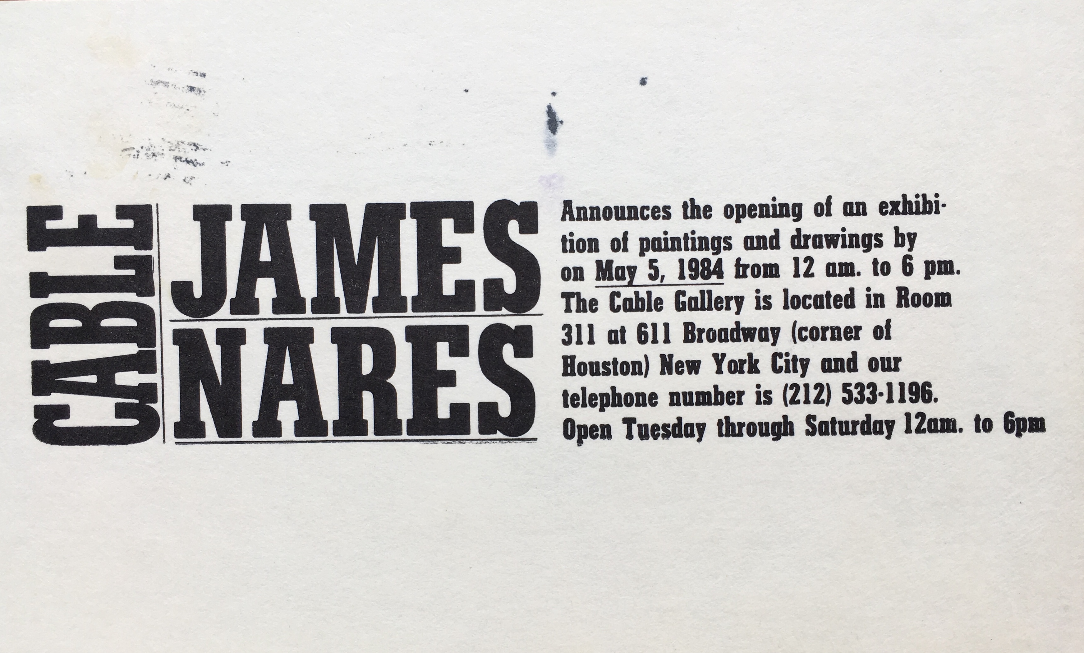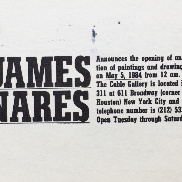 (James Nares). Cable announces the opening of an exhibition of paintings and drawings by James Nares on May 5, 1984