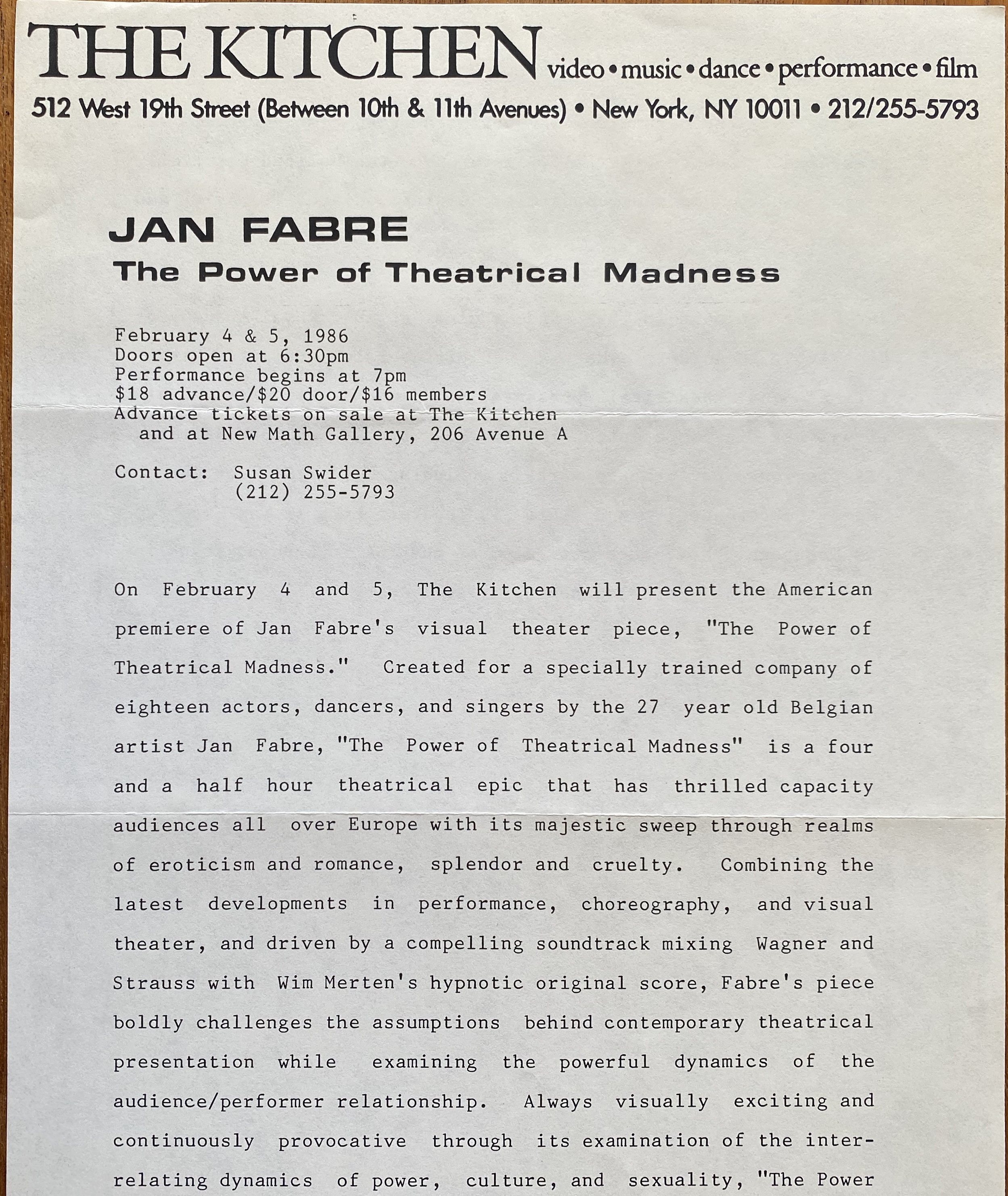 Jan Fabre. The Power of Theatrical Madness. The Kitchen, New York, February 4, 5, 1986