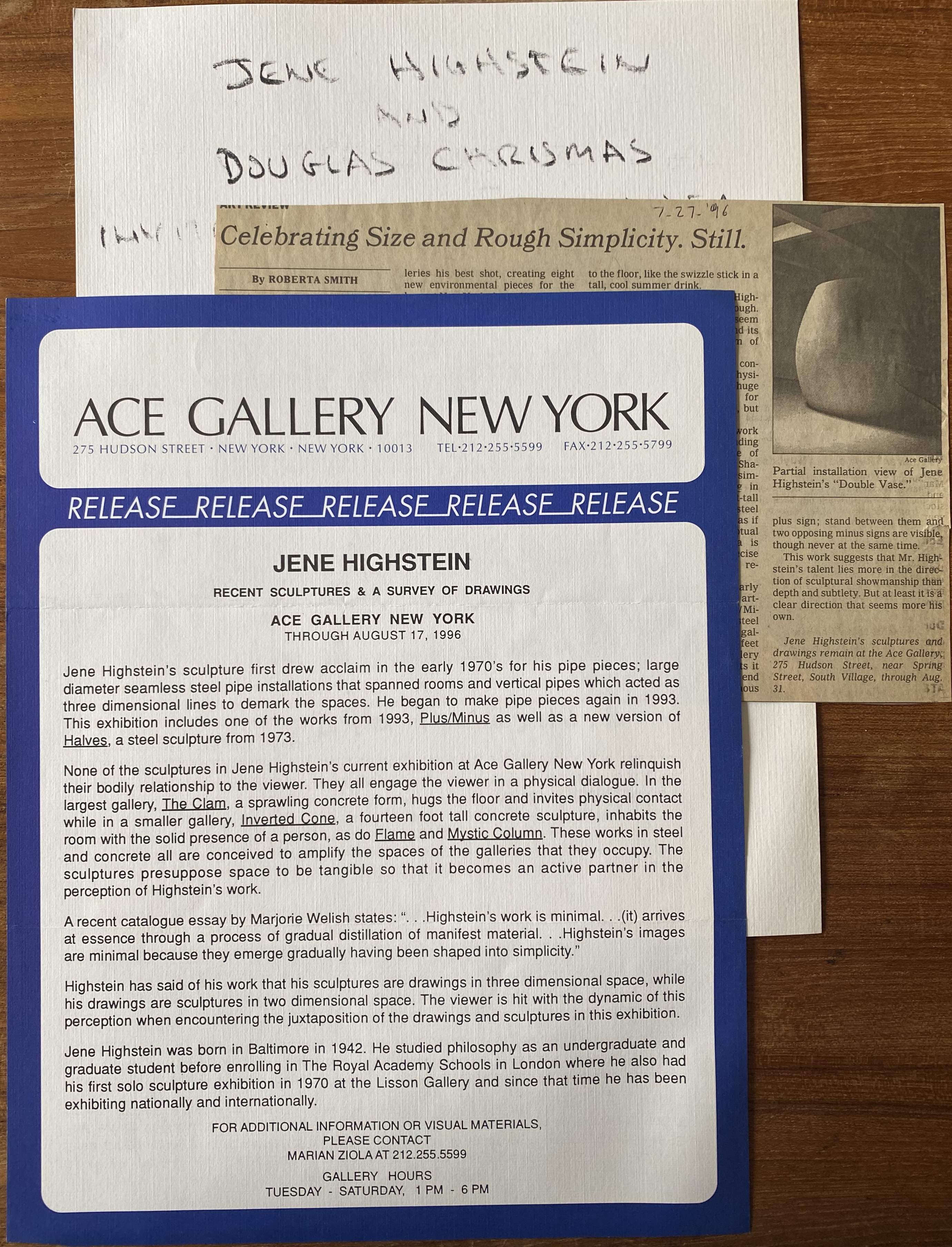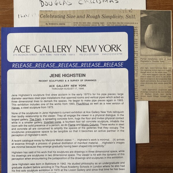 Jene Highstein. Recent Sculptures & a Survey of Drawings. Ace Gallery New York, New York, Through August 17, 1996