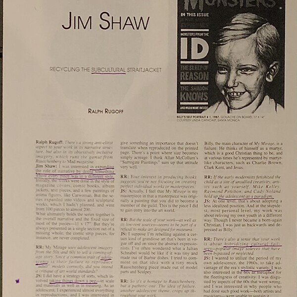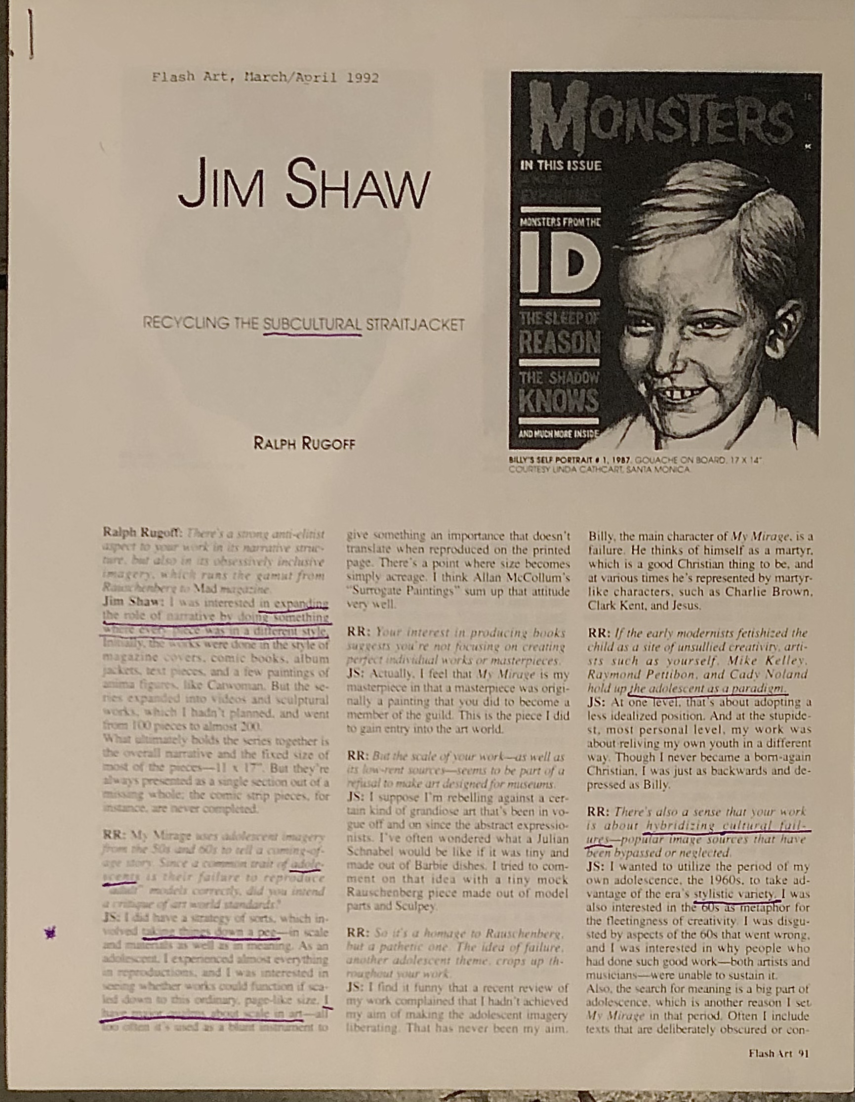 (Jim Shaw). Ralph Rugoff. Jim Shaw: Recycling the Structural Straitjacket. Flash Art. March / April 1992. (Photocopy). 3 pages (i.e. pages 91 – 93). 5 illustrations.