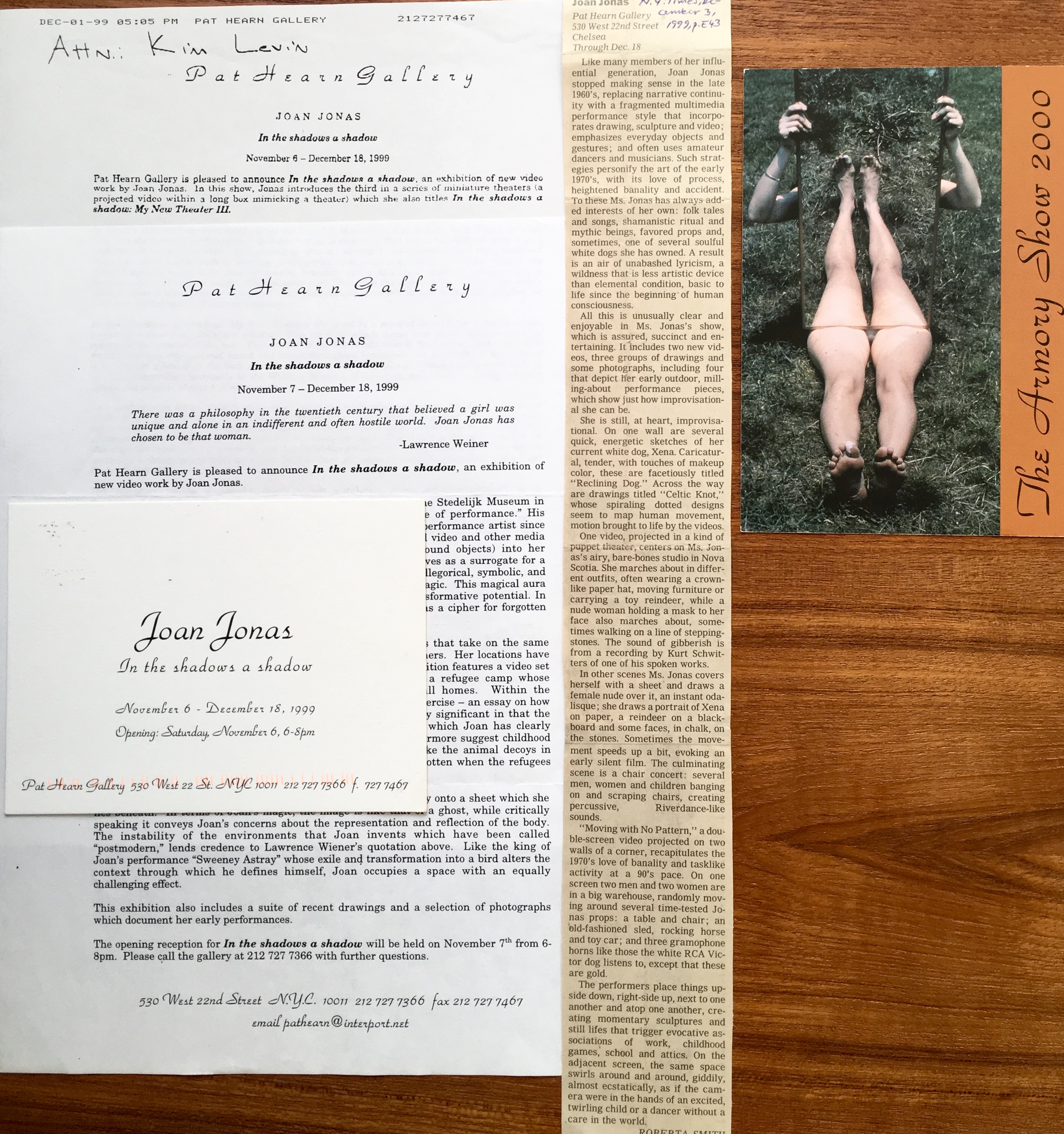 – Roberta Smith. Joan Jonas. The New York Times, December 3, 1999, page E 43. Clipping. 14 7/8 x
