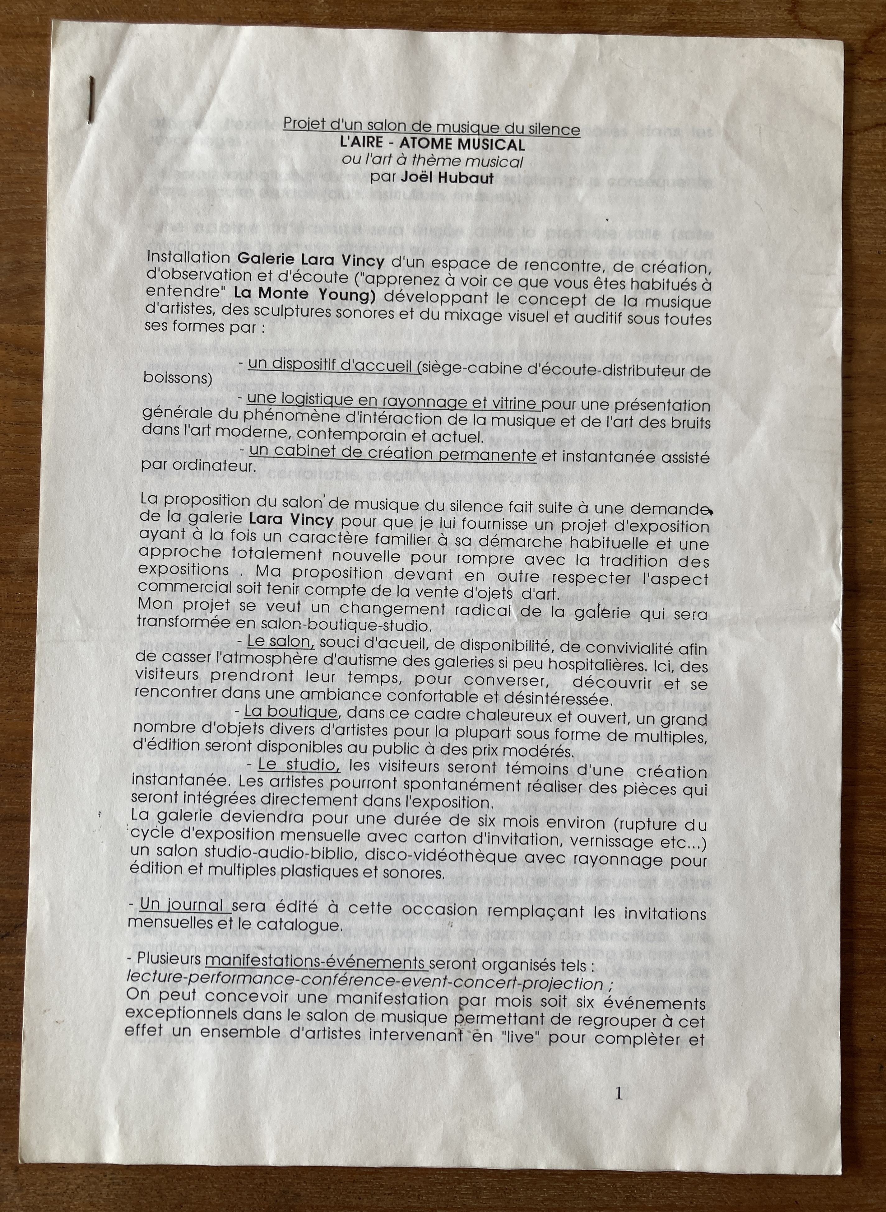 (Joël Hubaut). Projet d’un salon de musique du silence: L’aire – atome musical par Joël Hubaut. No Date. [1993]