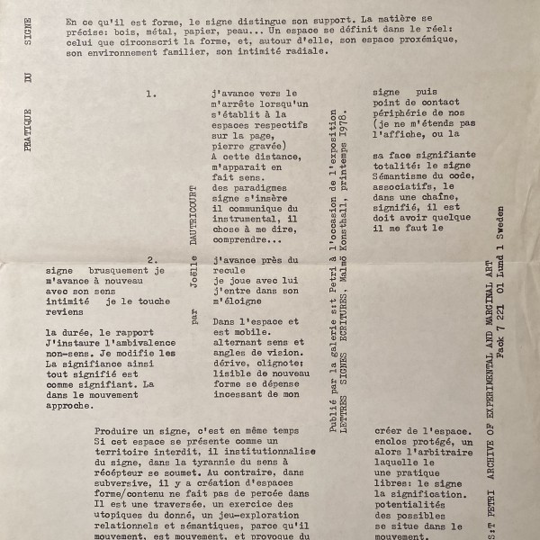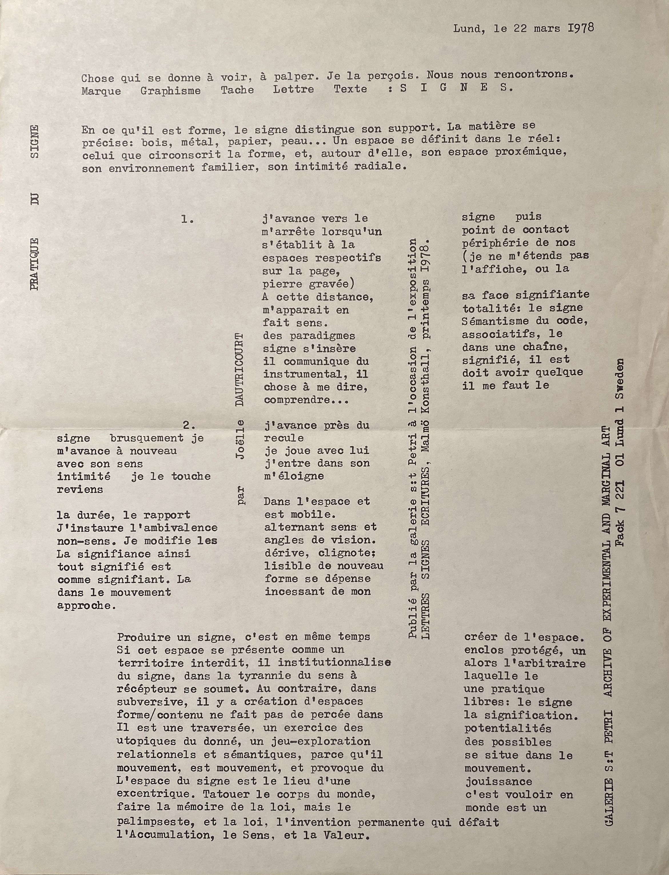Joëlle Dautricourt. Pratique du signe. 22 mars 1978. Lund: Galerie S:T Petri Archive of Experimental and Marginal Art, 1978