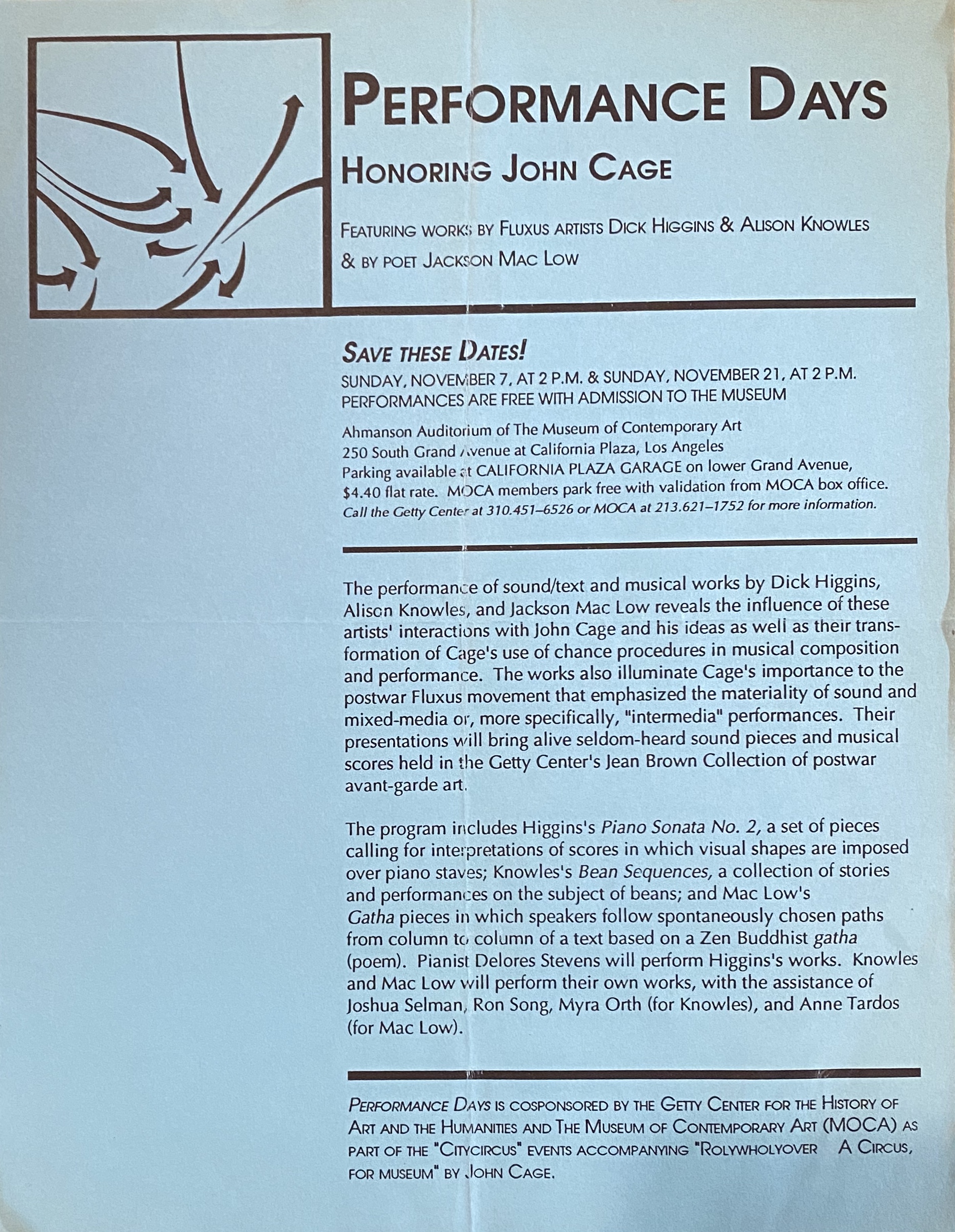 (John Cage). Performance Days. Honoring John Cage. Featuring Works by Fluxus Artists Dick Higgins & Alison Knowles, & by Poet Jackson Mac Low. Ahmanson Auditorium, The Museum of Contemporary Art, Los Angeles, November 7 and 21, [1993]