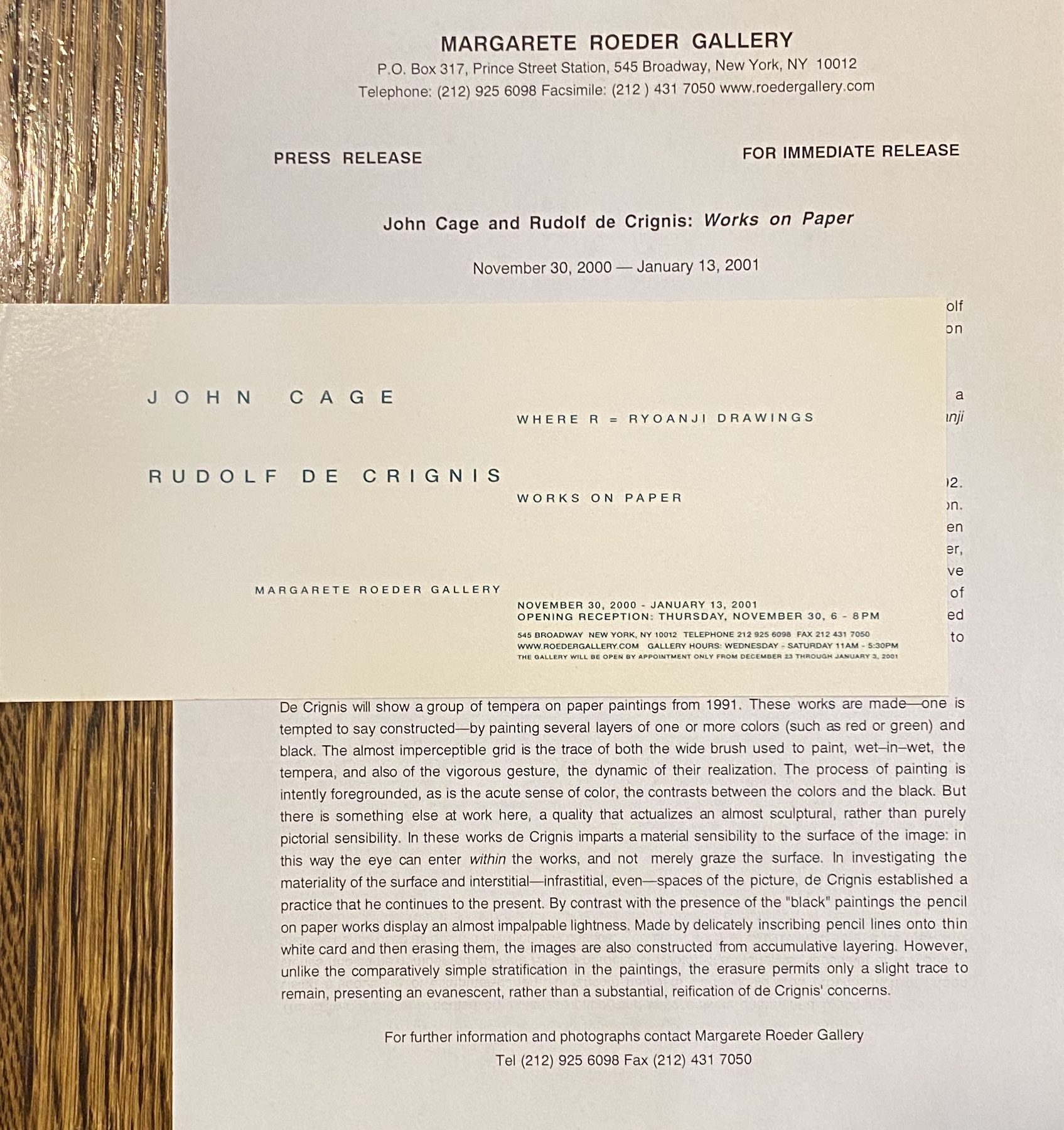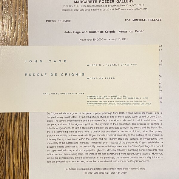 (John Cage, Rudolf de Grignis). John Cage: Where R – Ryoanji Drawings / Rudolf de Grignis: Works on Paper. Margarete Roeder Gallery, New York, November 30, 2000 – January 13, 2001