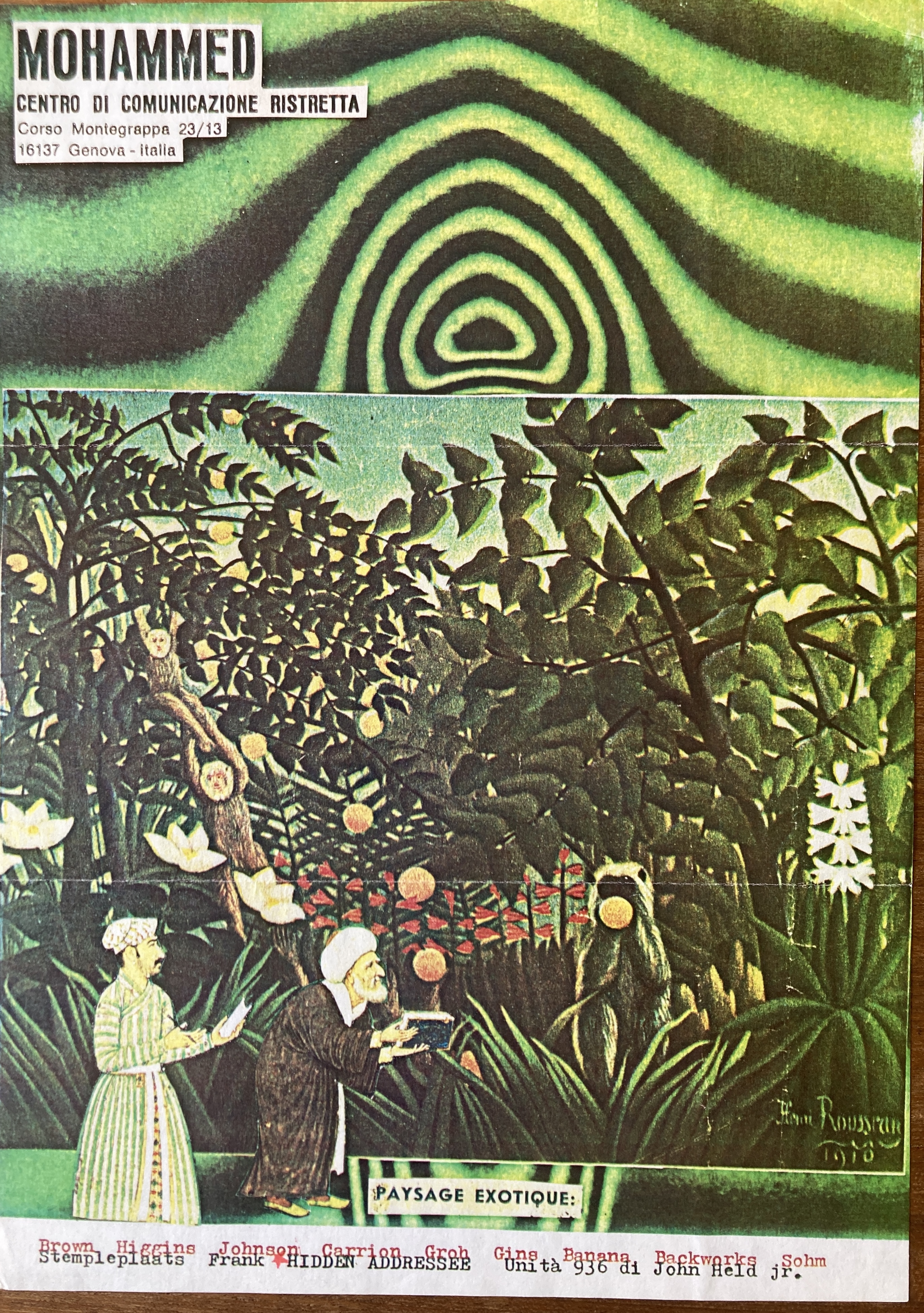John Held Jr. Untitled. Geneva: Mohammed, Centro di Communicazione, Ristretta, no date. Unitá 936.