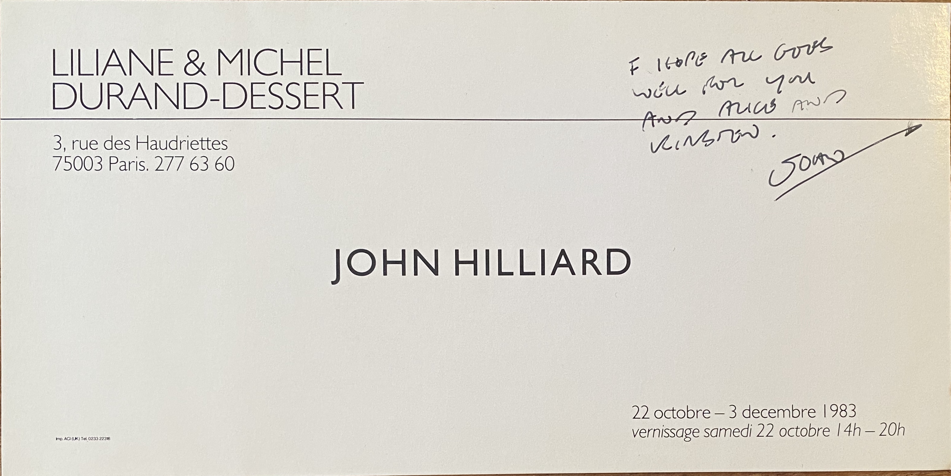 (John Hilliard). John Hilliard. Lilian & Michel Durand-Dessert, Paris, 22 octobre – 3 décembre 1993