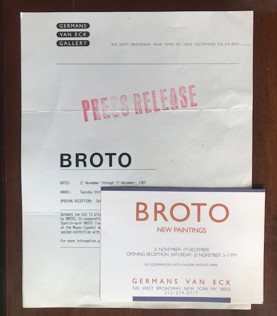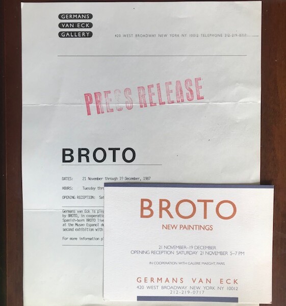 (José Manuel Broto). Broto. New Paintings. Germans van Eck, New York, 21 November-19 December [1987]