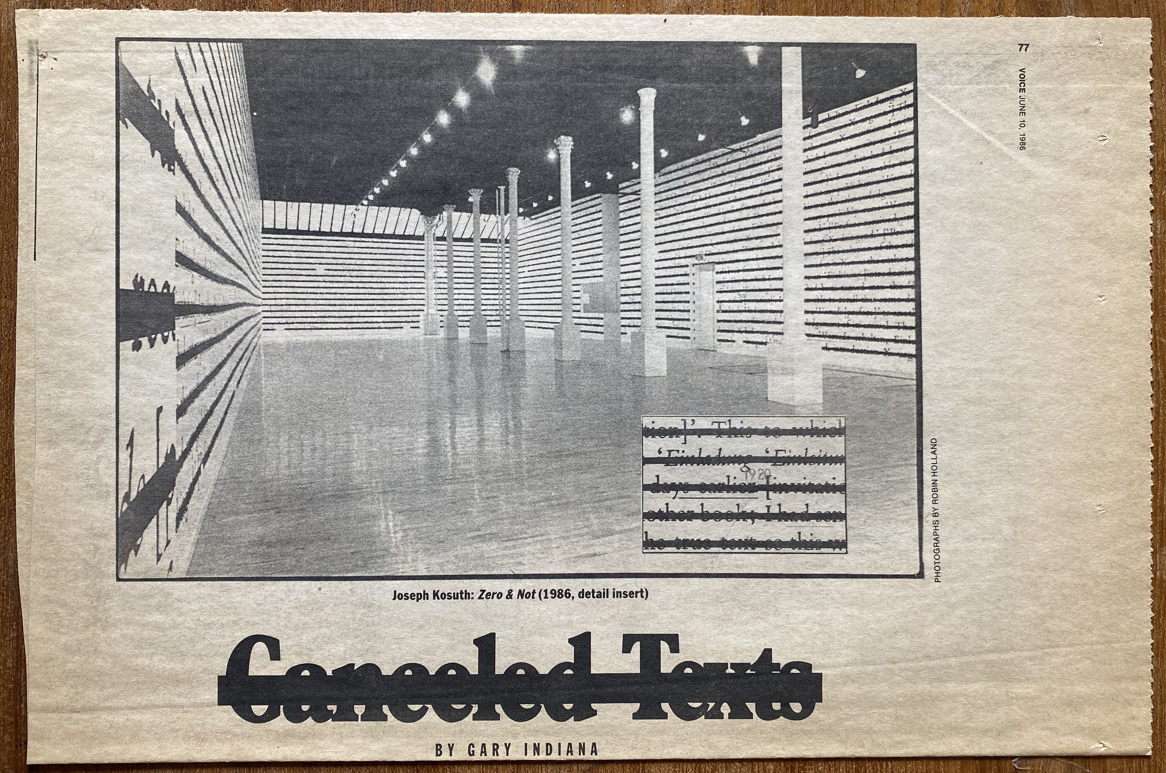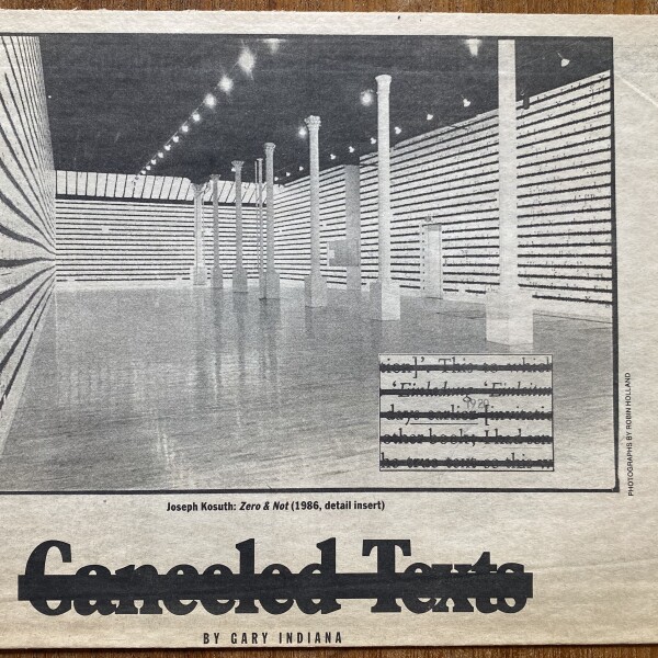 (Joseph Kosuth). Gary Indiana. C̶a̶n̶c̶e̶l̶e̶d̶ ̶T̶e̶x̶t̶s̶. The Village Voice. June 10, 1986, Clipping