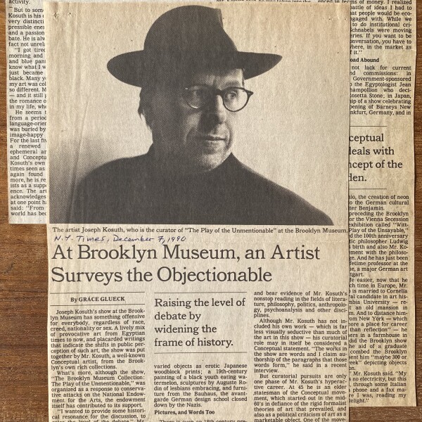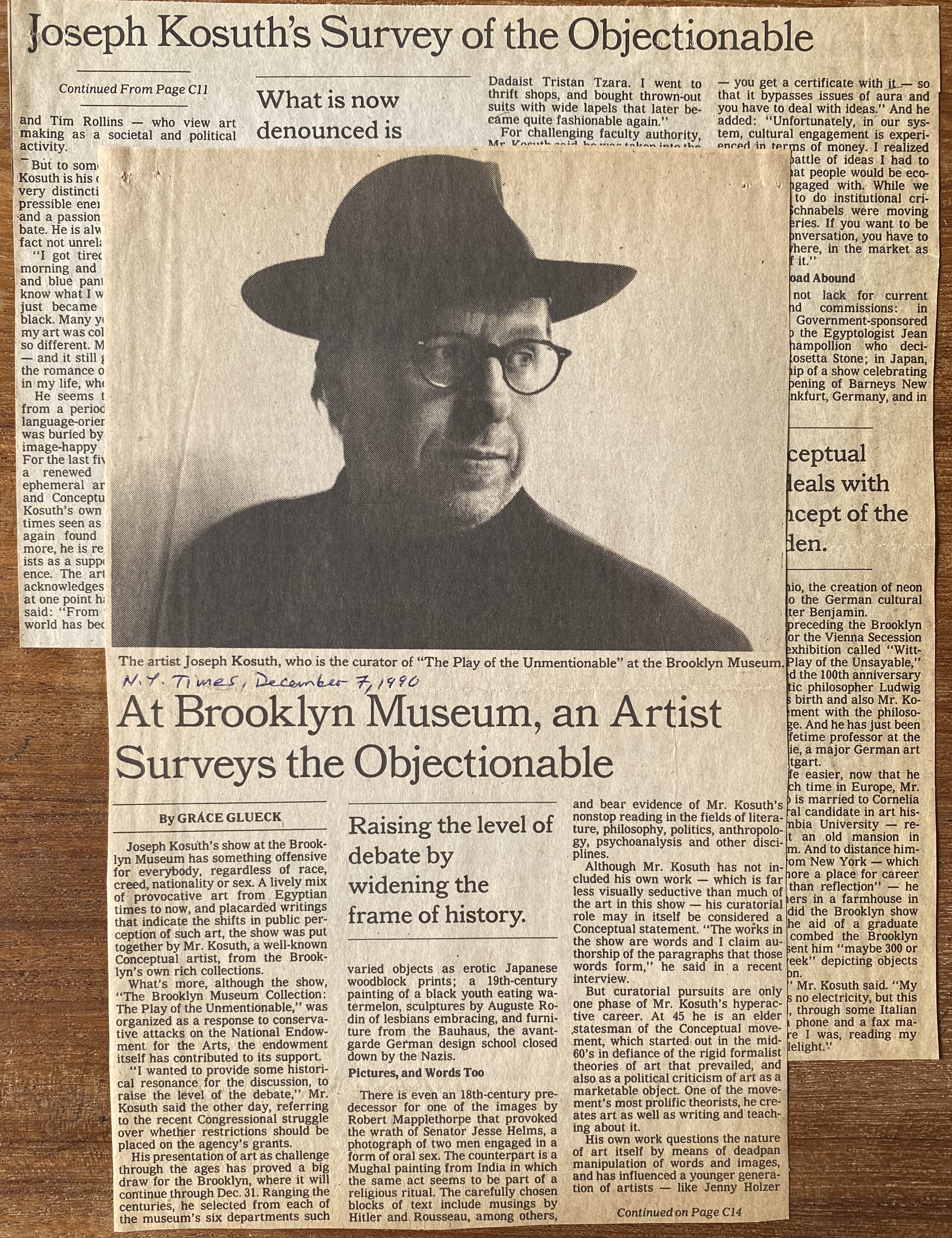 (Joseph Kosuth). Grace Gleuck. At Brooklyn Museum, an Artist Surveys the Objectionable.The New York Times. December 7, 1990. Clipping