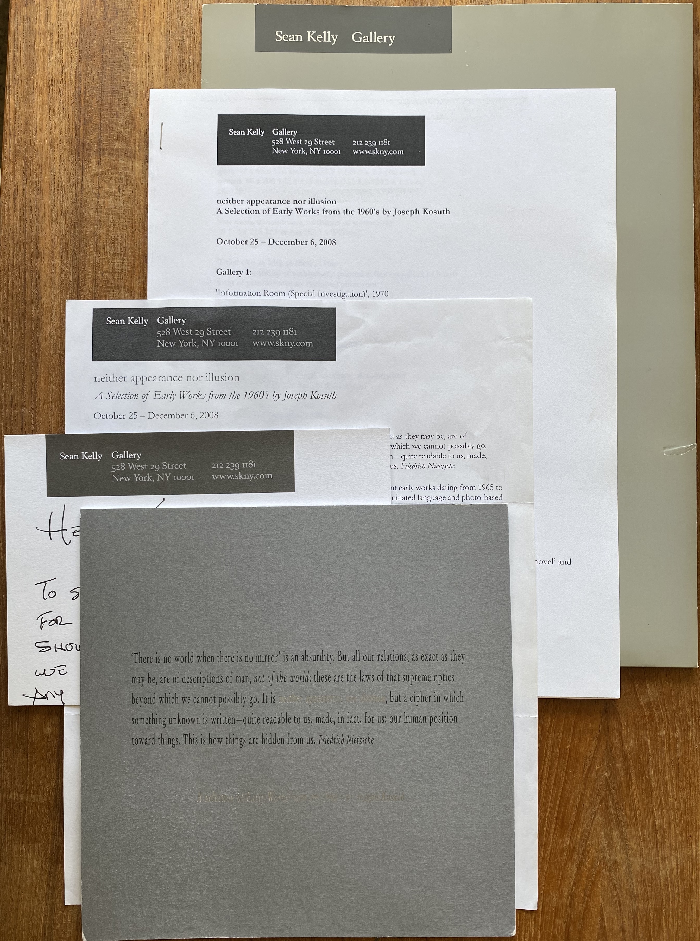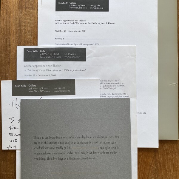 (Joseph Kosuth). neither appearance nor illusion. A Selection of Early Works from the 1960’s by Joseph Kosuth at Sean Kelly, opening October 24, [2008]