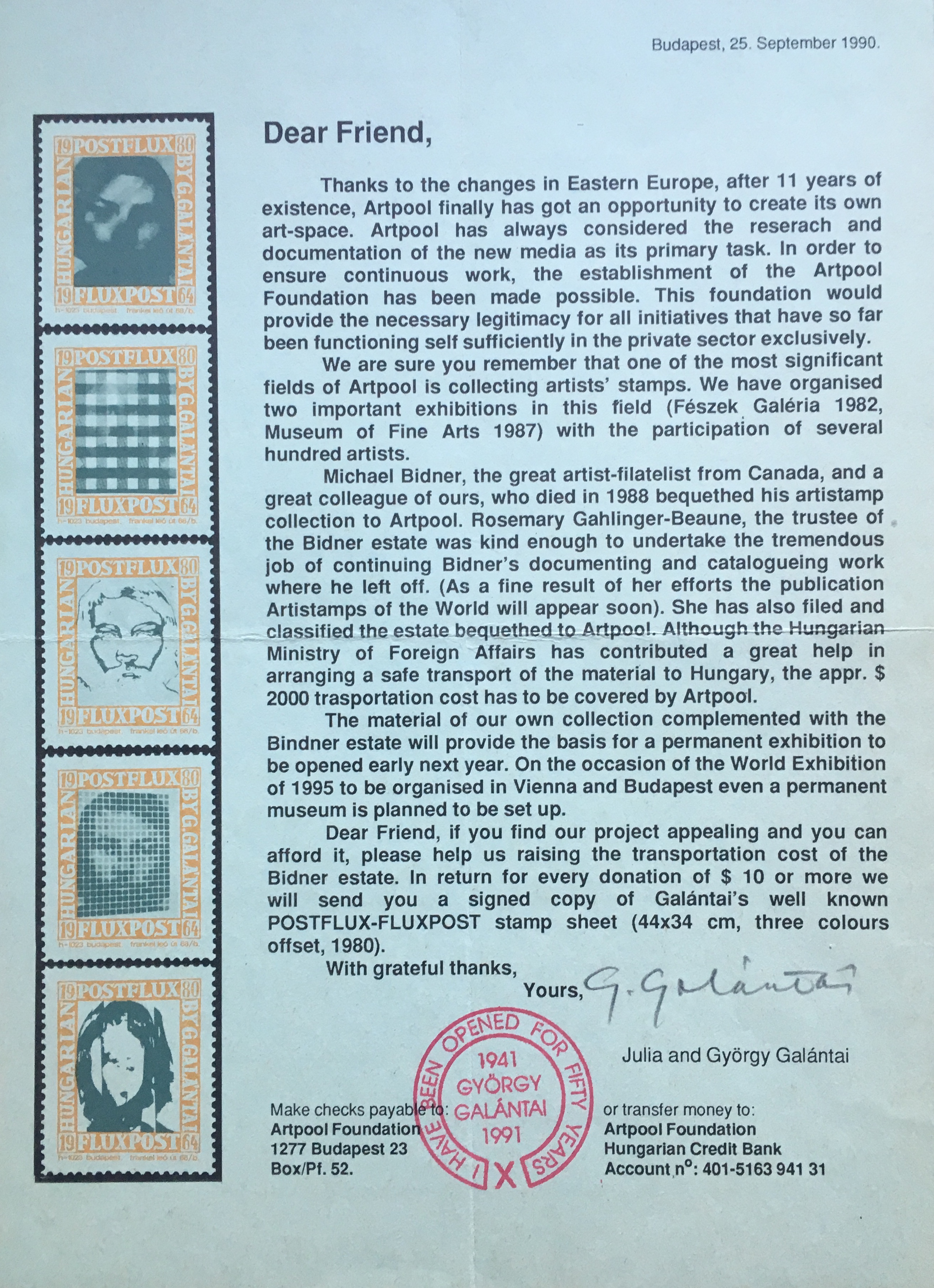Julia and György Galántai. 1-page form letter, Budapest, 25 September 1990, signed in pencil by György Galántai. Illustrated with 5 of his Post flux stamps and hand stamp