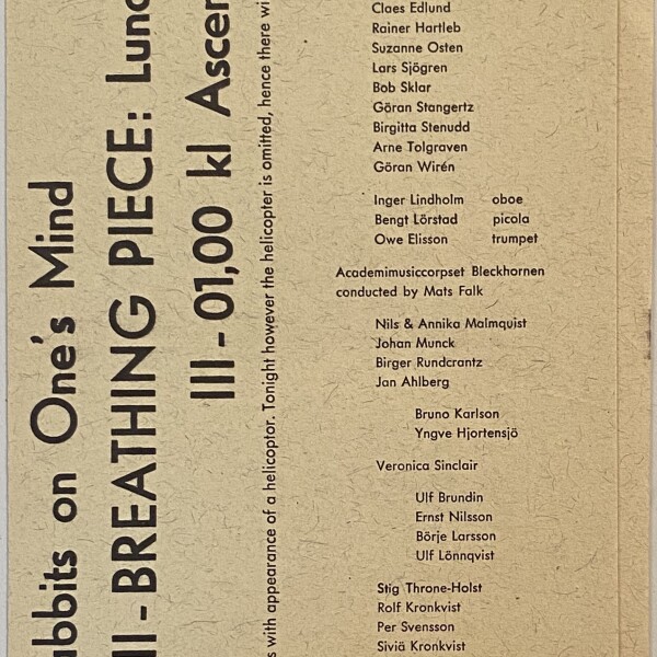 (Kenneth Dewey). I – Rabbits on One’s Mind / II – Breathing Piece: Lund / III – 01,00 kl Ascension. Ken Dewey, Playwright. Studentaftonutskottet, Lund, 14.v.64