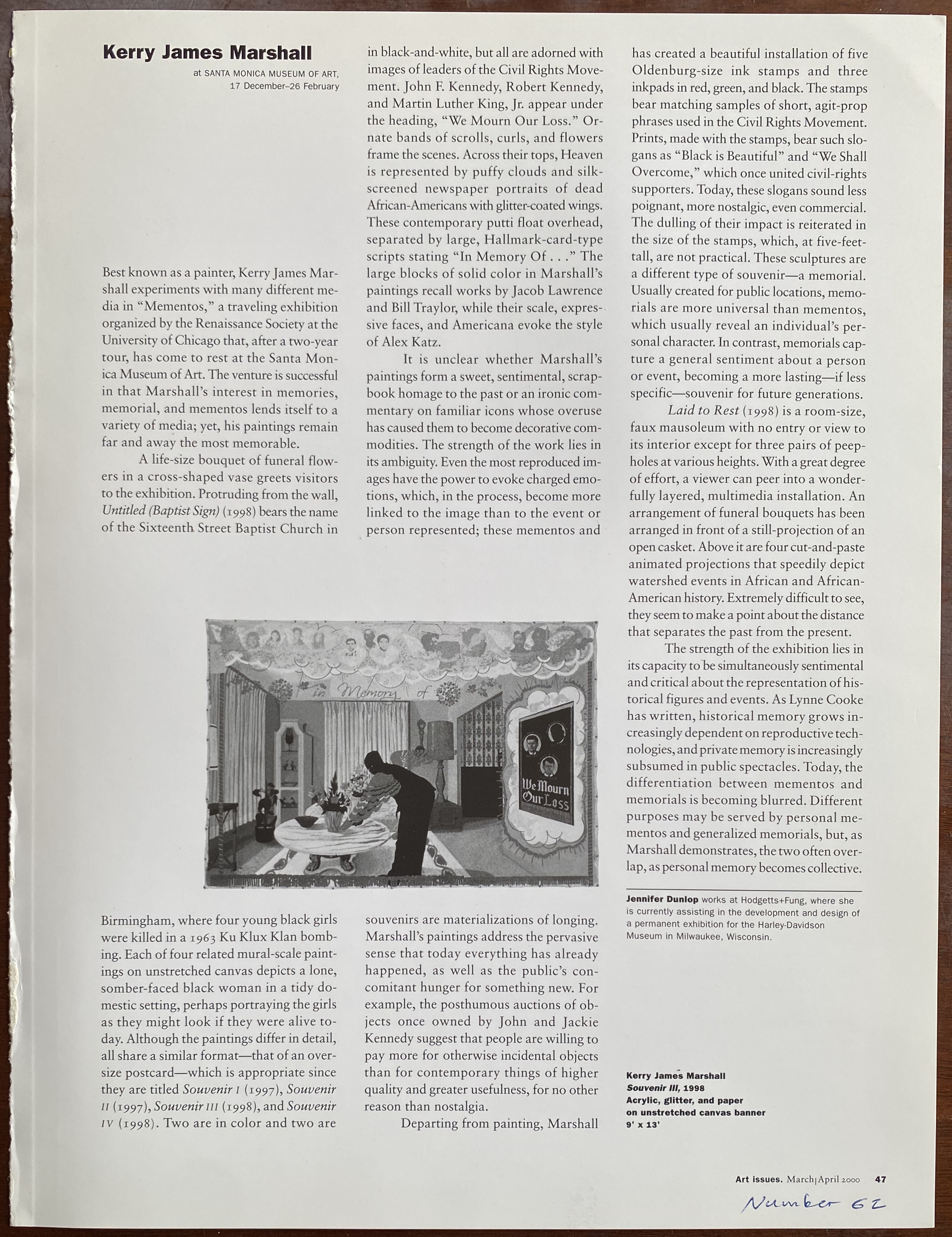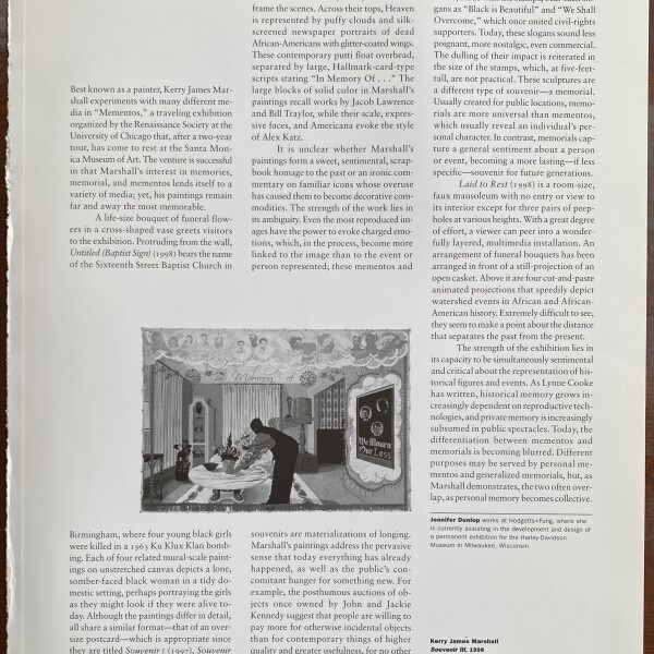 (Kerry James Marshall). Jennifer Dunlap. Kerry James Marshall. Art Issues. Number 62, March/April 2000. 1 page / (i.e. page 47). 1 illustration. Clipping