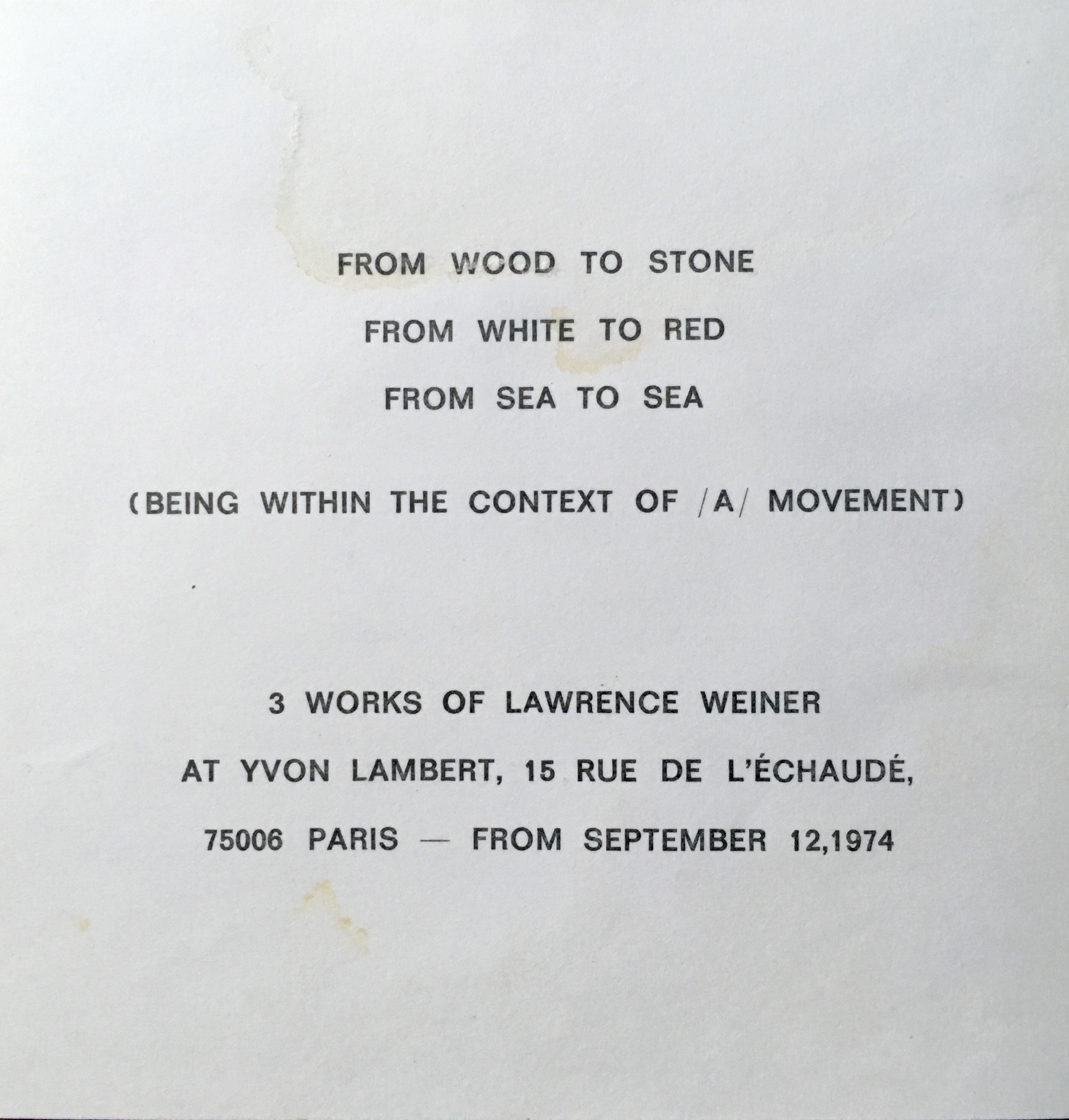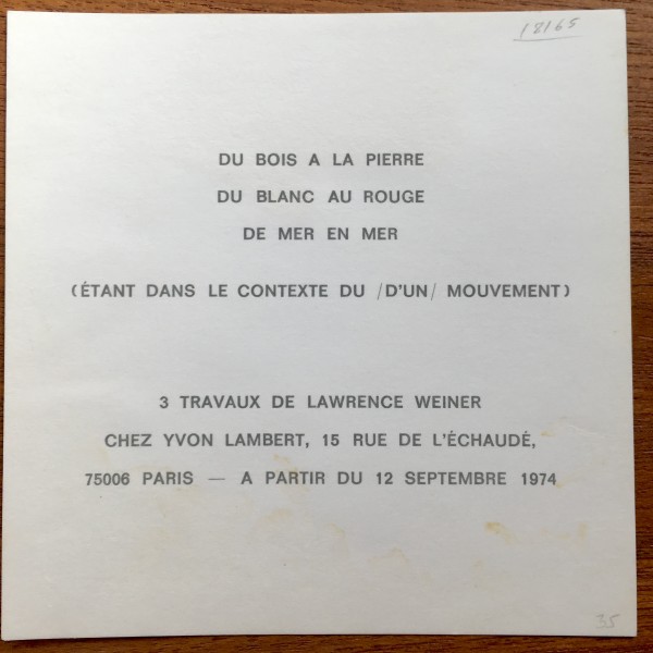 (Lawrence Weiner). 3 (i.e. Three) works of Lawrence Weiner. Yvon Lambert, Paris, from September 12, 1974