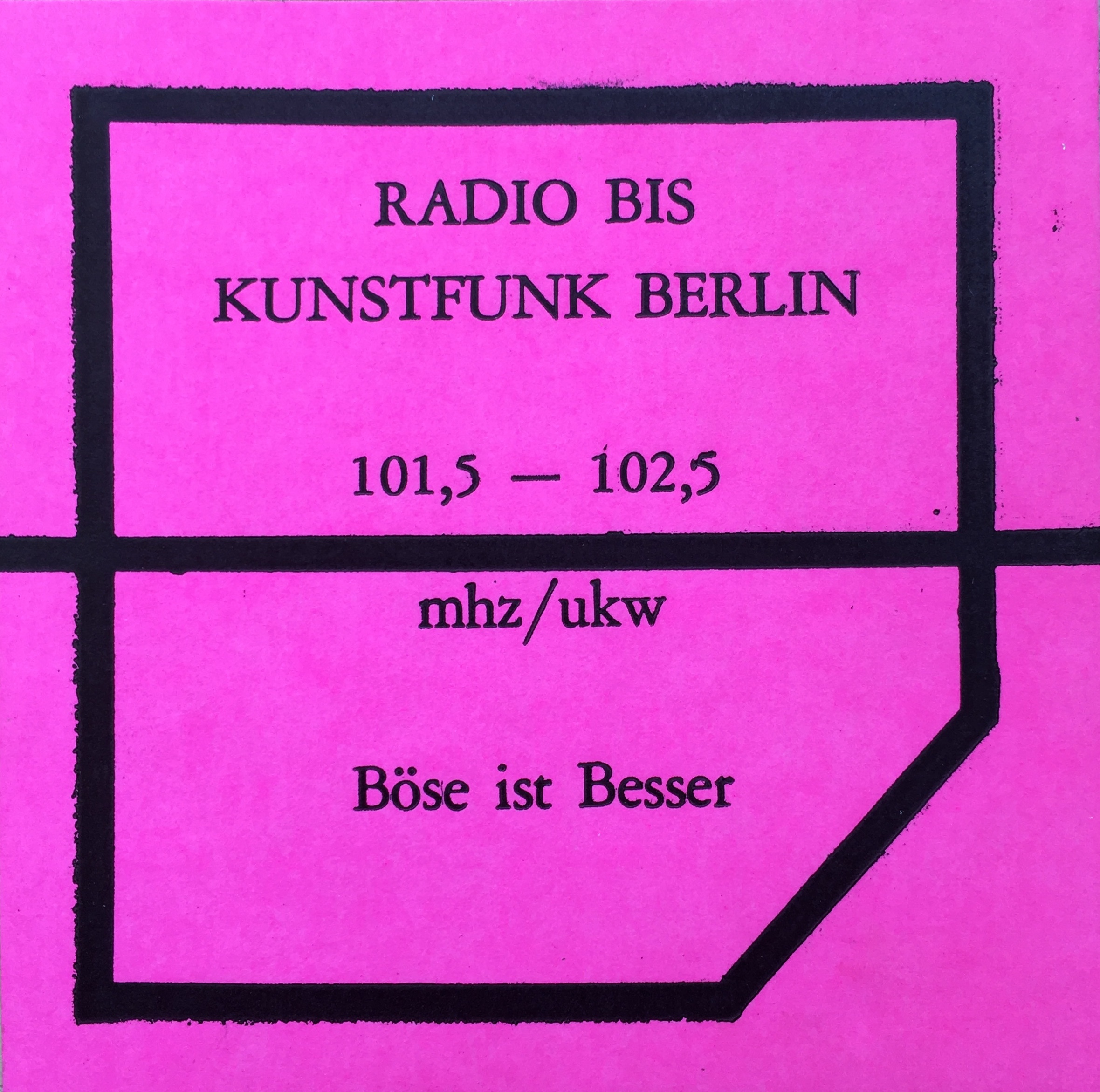 (Lawrence Weiner). Böse ist besser. Radio Bis, Kunstfunk Berlin, [1982] Sticker 3 x 3″ / 7.6 x 7.6cm