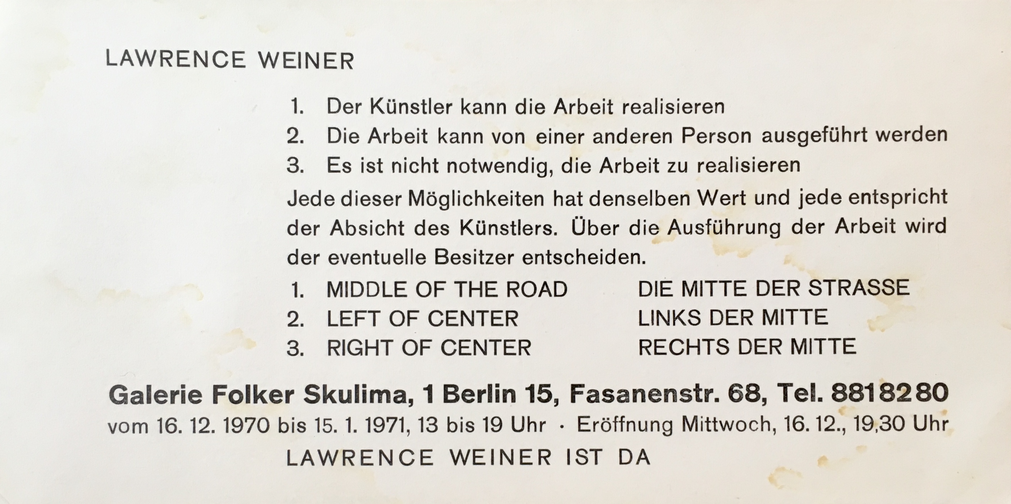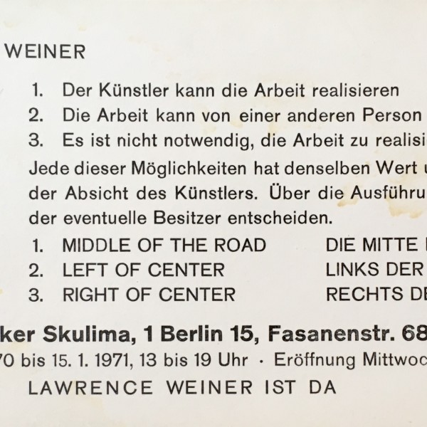 Lawrence Weiner. I. Middle of the road / Die Milte der Strasse… . Galerie Folker Skulime, Berlin, 16.12.1970 – 15.1.1971