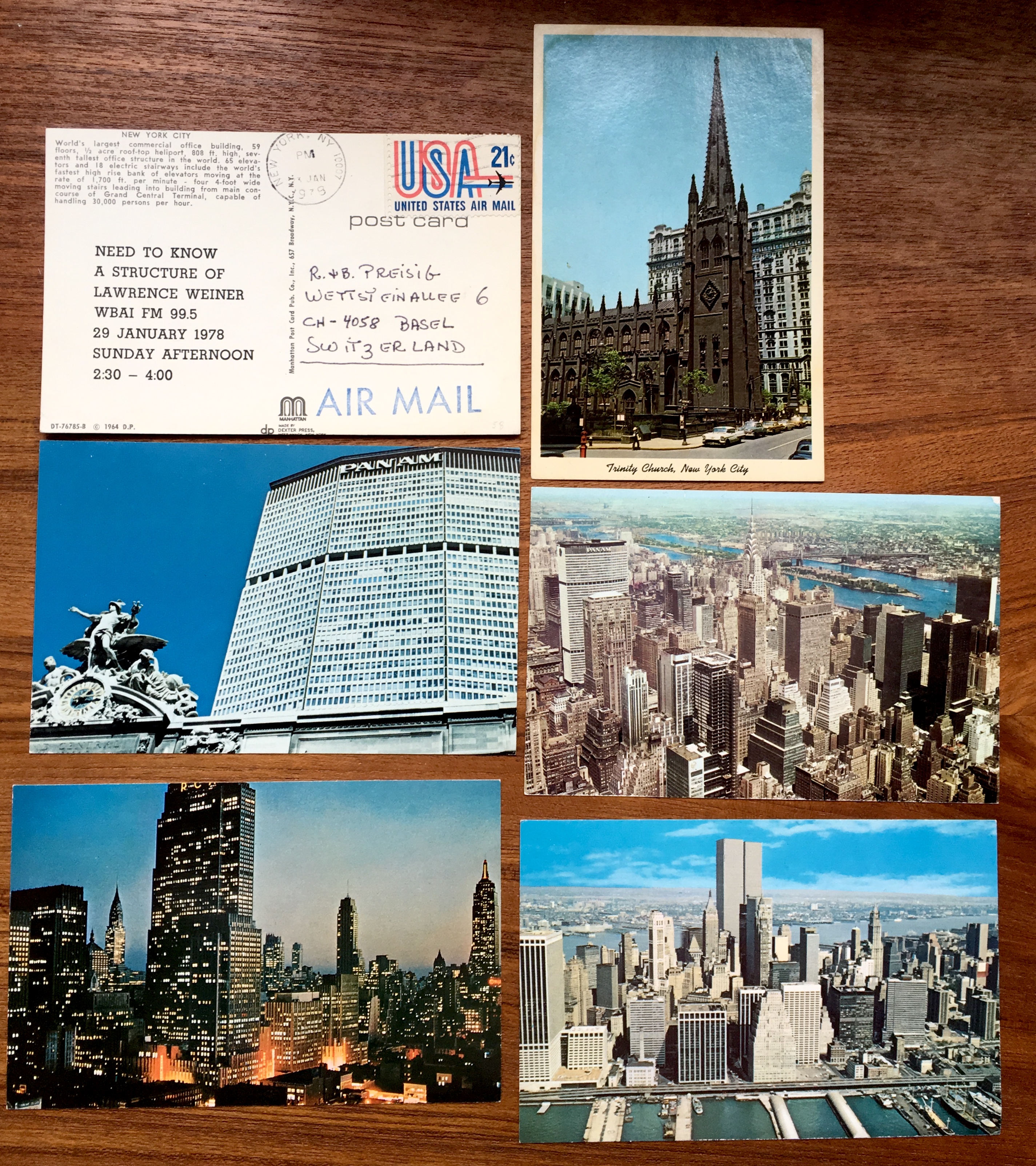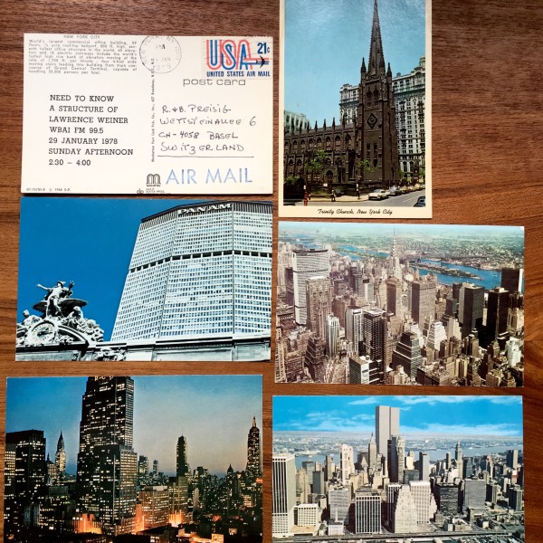 Set of 6 commercial color postcard views of New York City, each with the “Need to know” broadcast information printed on the text side, 1 mailed postcard addressed to Rolf Preisig by hand by Weiner