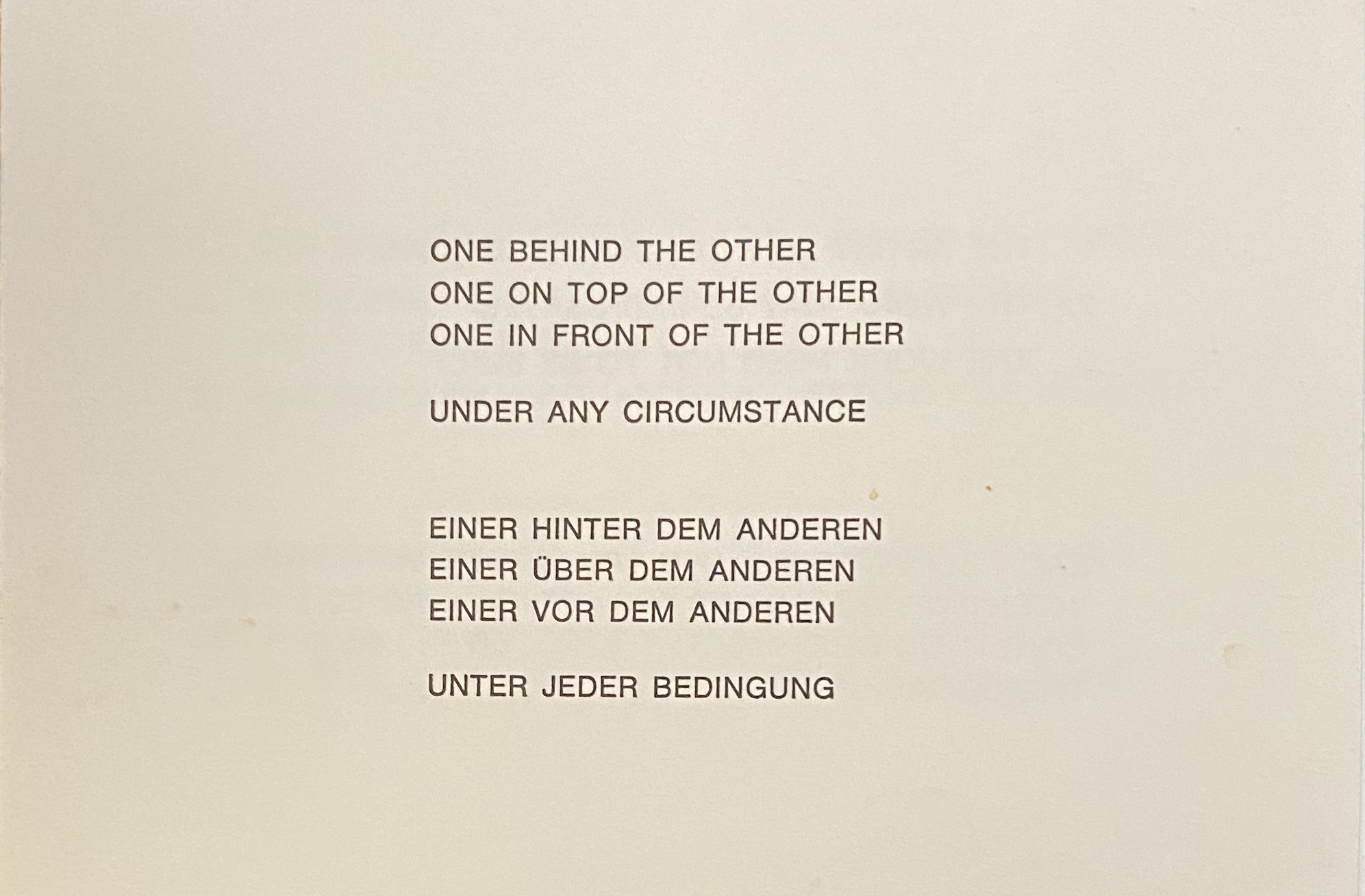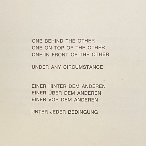 Lawrence Weiner. One behind the other / one on top of the other / one in front of the other / under any circumstance // Einer hinter dem anderen / Einer über dem anderen / einer ver dem anderen / unter jeder bedingung. Galerie Schöttle, München, 20.11. – Dezember 1976