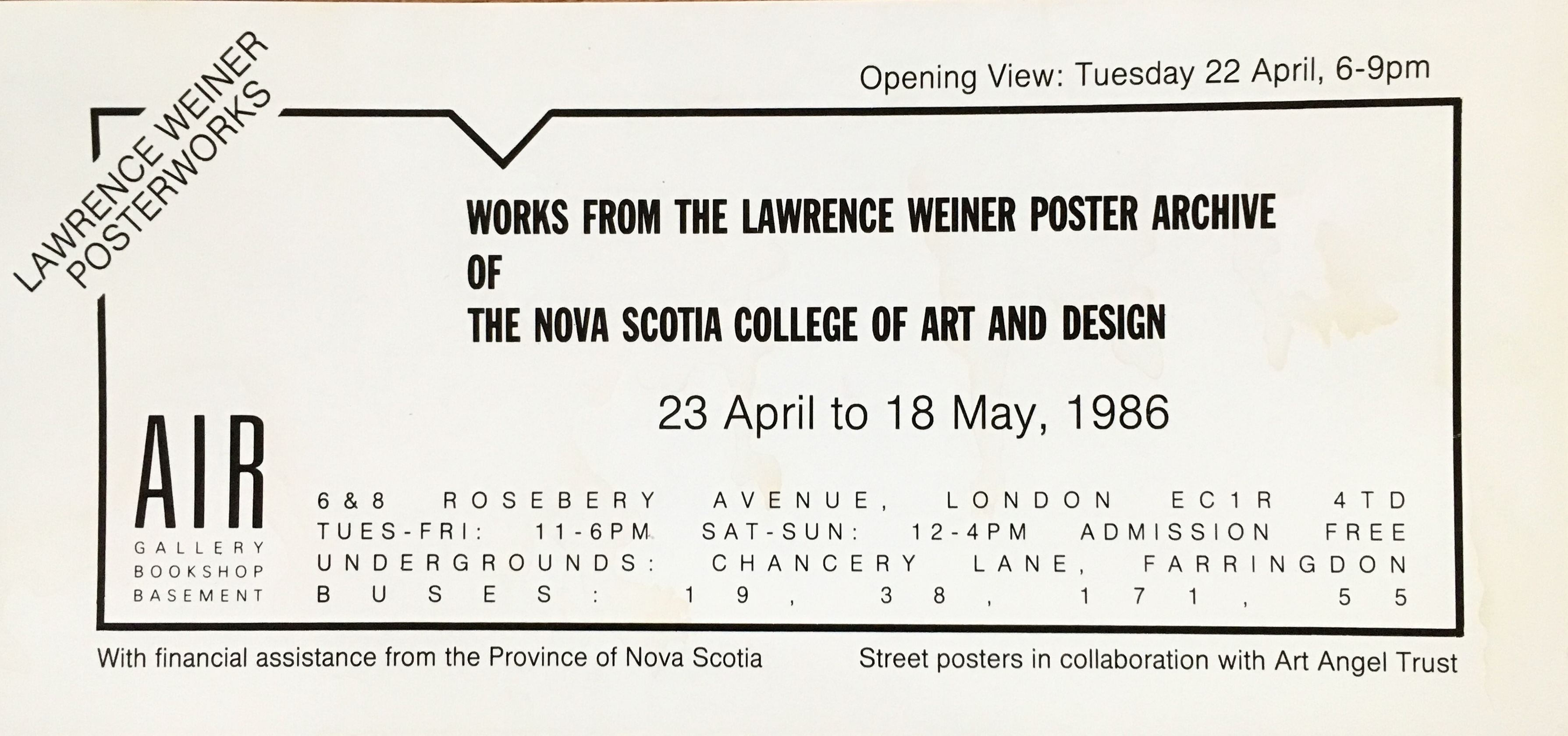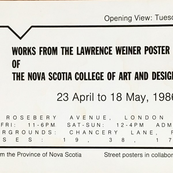 Lawrence Weiner. Works from the Lawrence Weiner poster archive of the Nova Scotia College of Art and Design. A I R, London, 22, 23 April – 18 May 1986
