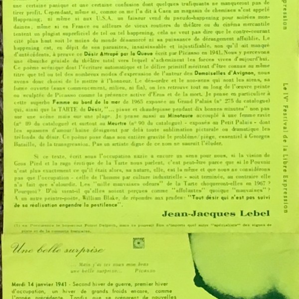 Program: Picasso’s Le désir attrapé par la queue, projections de films (Tony Conrad, Olto Mühl, Taylor Mead, Martial Raysse, others), “happenings, concerts et pièces diverses”