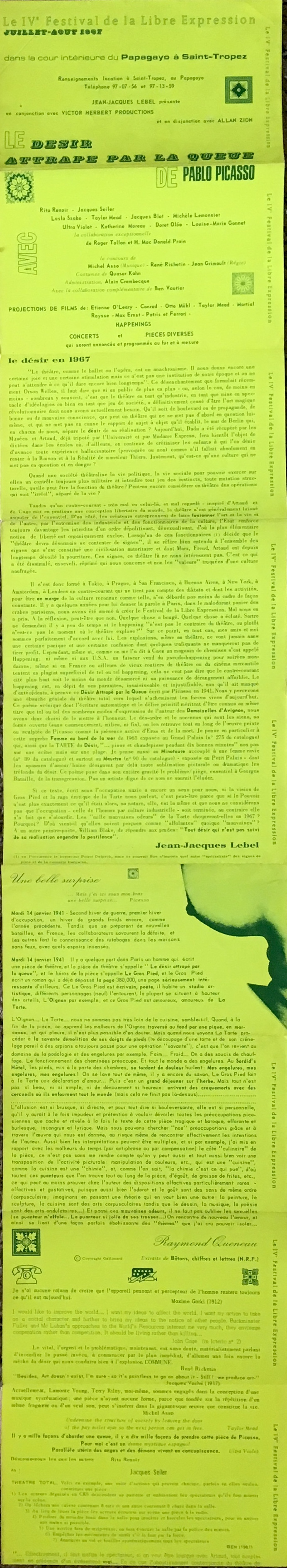 Texts: Le désir en 1967 by Jean-Jacques Lebel; reprinted text by Raymond Queneau; series of quotes from various writers from Leon Trotzky to John Cage
